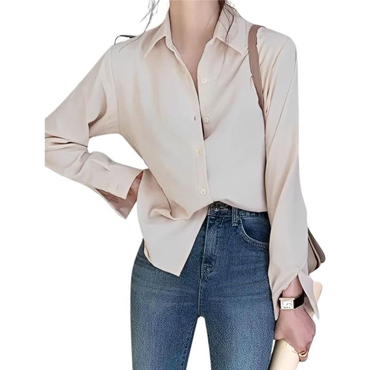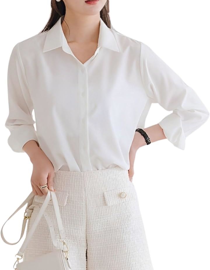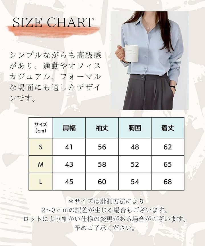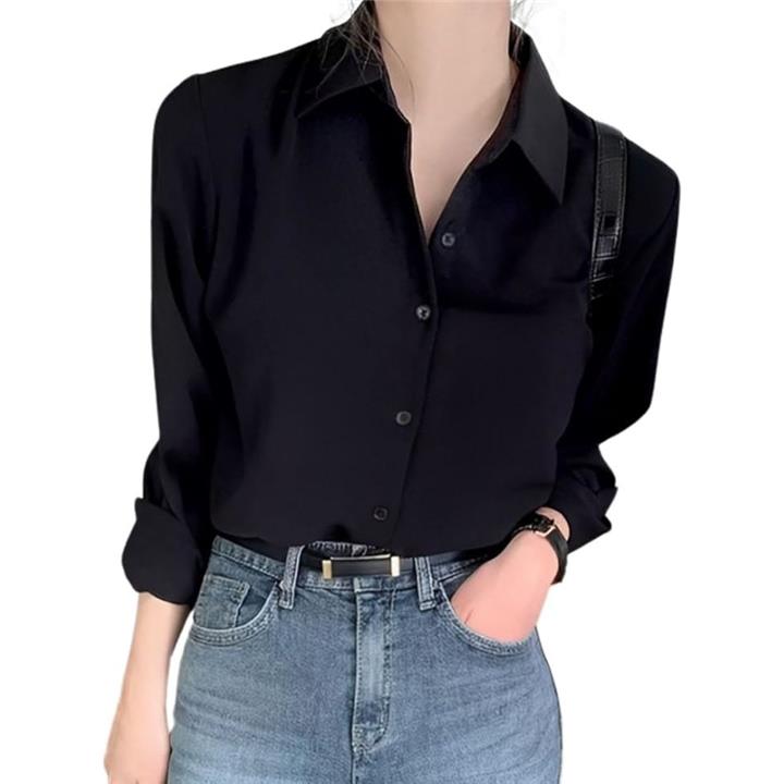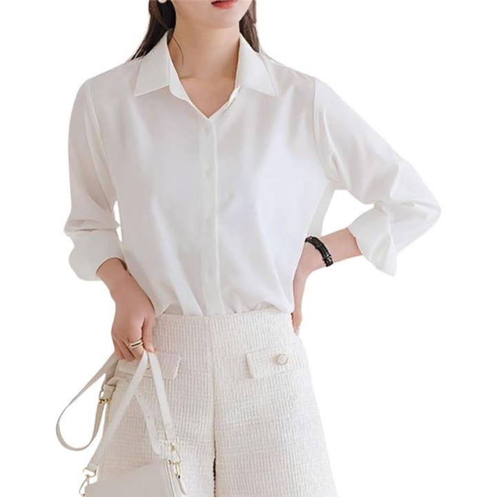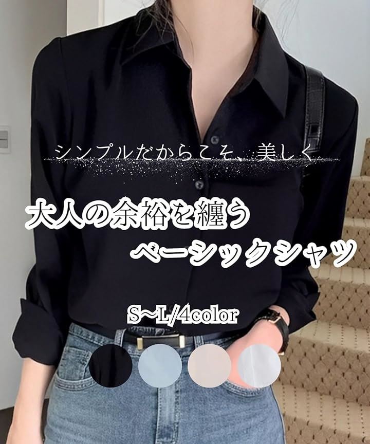 [Four leaf] 長袖 シャツ レディース シフォン素材 ポロカラー 無地 通勤 オフィスカジュアル ゆったり 着痩せ 韓国風 体型カバー トップス きれいめ フォーマル |