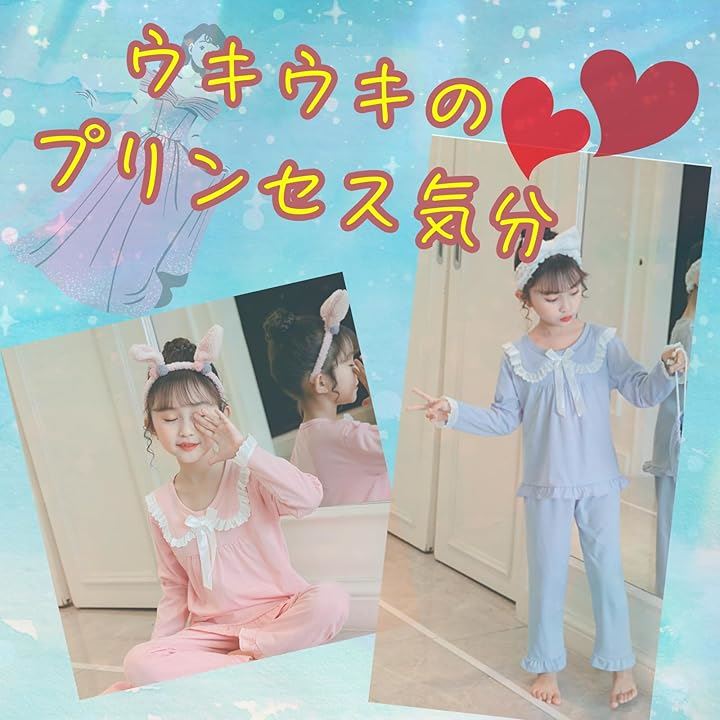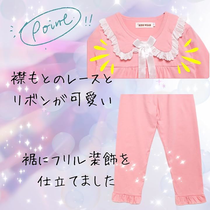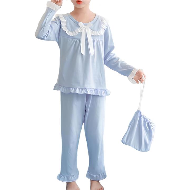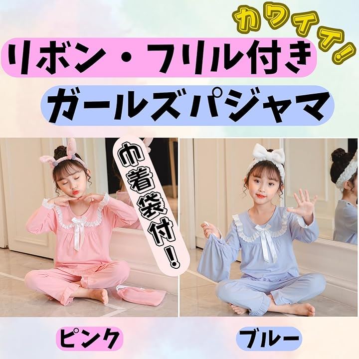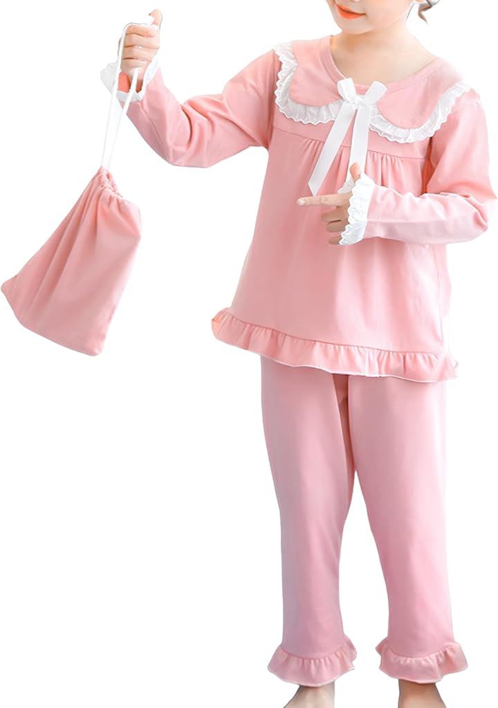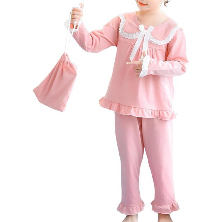 キッズ パジャマ 長袖 上下セット リボン フリル プルオーバー ガールズパジャマ 巾着袋 付き お泊まり 無地 ぱじゃま キッズパジャマ 長袖パジャマ ねまき 寝間着 ネグリジェ 春 夏 秋 かわいい おしゃれ