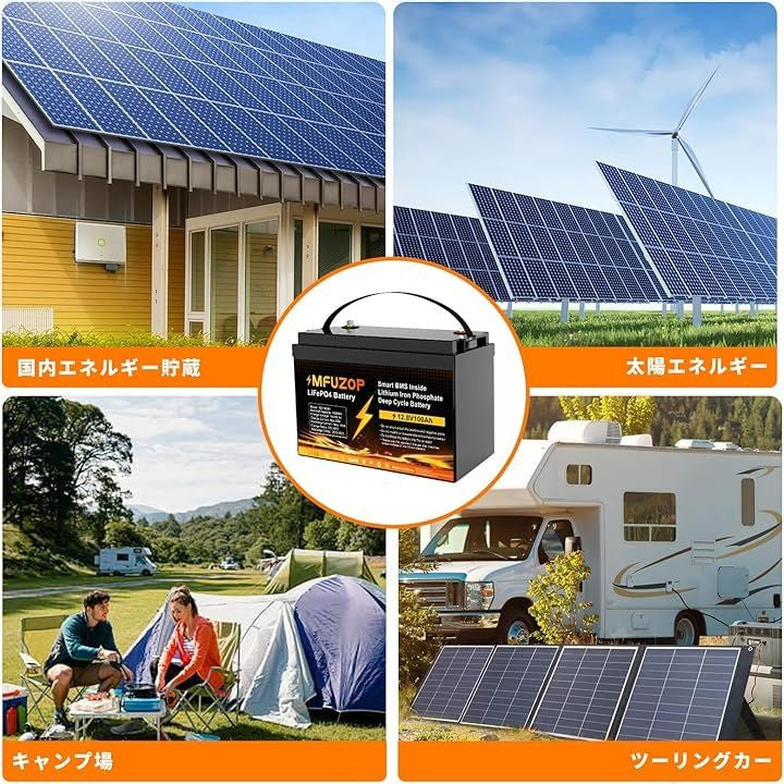 「幅広い用途」MFUZOP 12V100Ah LiFePO4 ディープサイクルバッテリーは、大電流に対する強い耐性、高い充電効率、安定した性能を備えています。