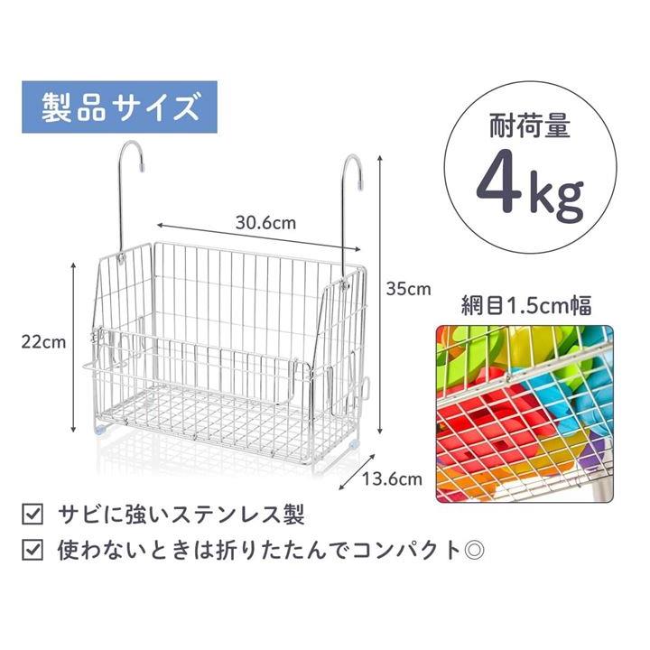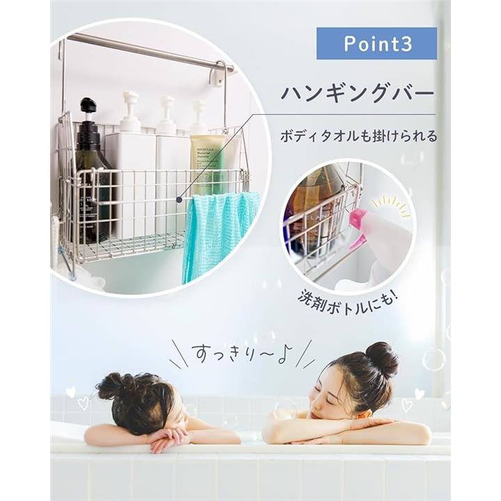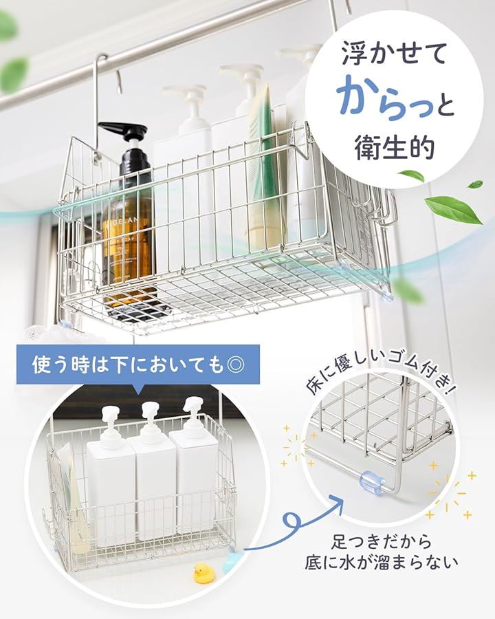 このステンレス製の吊り下げ式お風呂ラックは、浴室乾燥の物干し竿やタオルバーに引っかけるだけで、限られたスペースを有効活用できます。