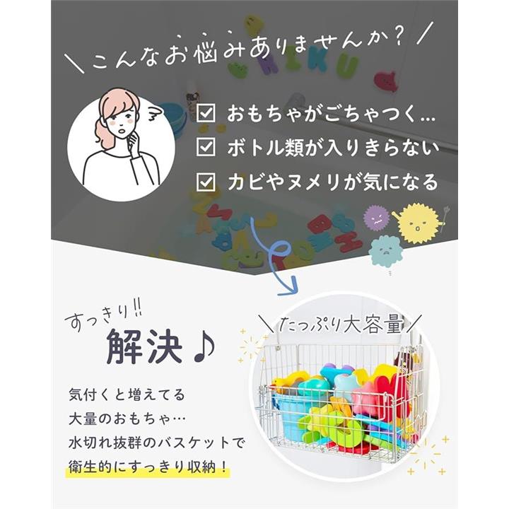 「たっぷり大容量」家族が各自バラバラのシャンプーを使っていて、ボトルが仕舞い切れない…お風呂のおもちゃが床に散らばってイライラ…こんな経験はありませんか? 浴室バスケットは大容量設計で、ごちゃつく水遊びグッズもボトルもまとめてスッキリ収納できます。