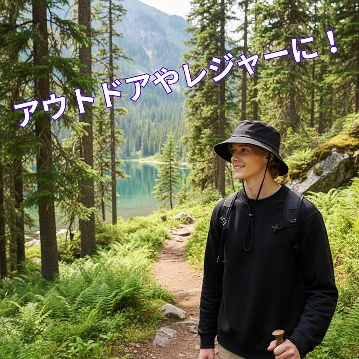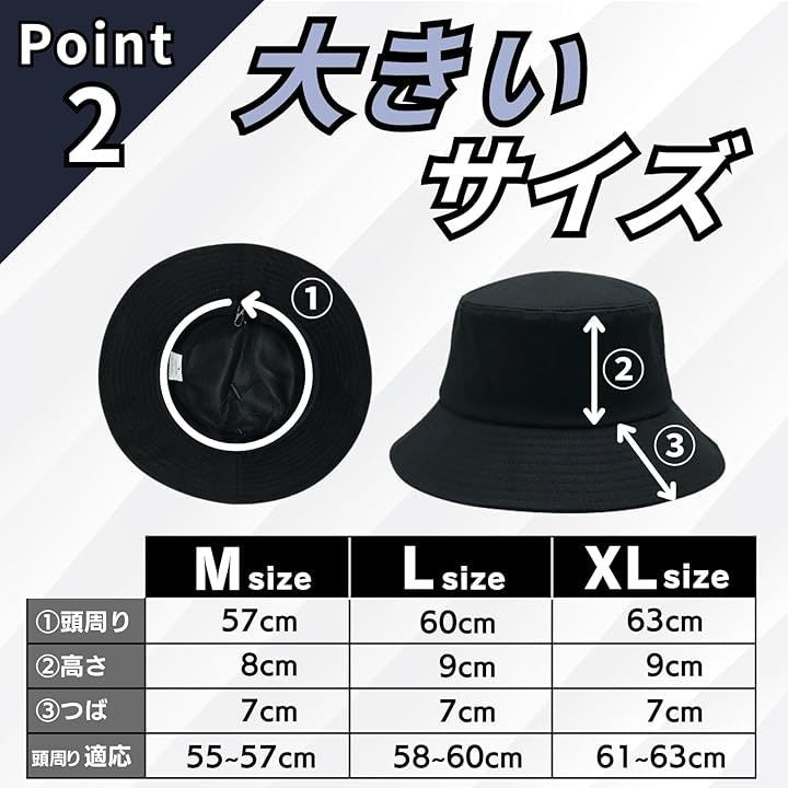 v「大きいサイズ対応」Mサイズ:頭周り:約55-57cm(調節可能)、Lサイズ:頭周り:約58-60cm(調節可能)、XLサイズ:頭周り:約61-63cm(調節可能)、深さ:約9cm、つばの長さ7cm、付属品:あご紐。