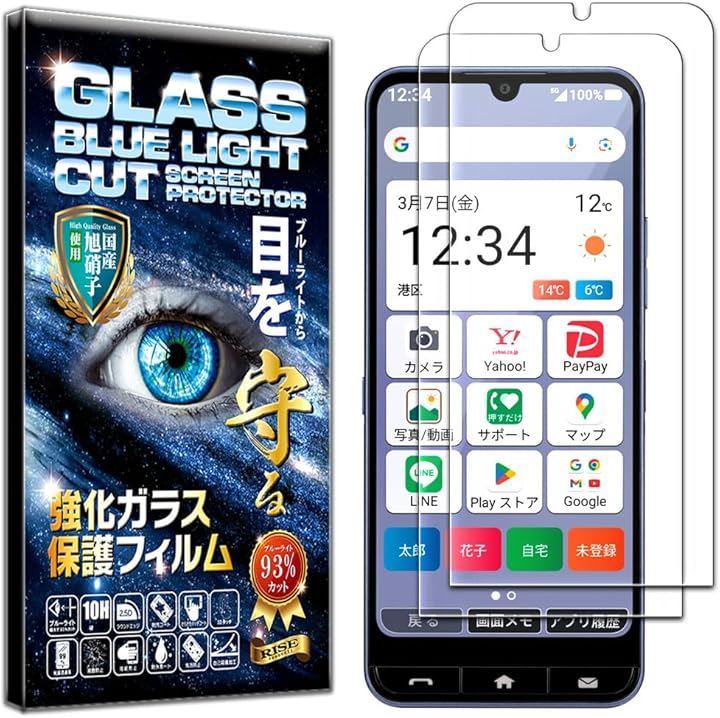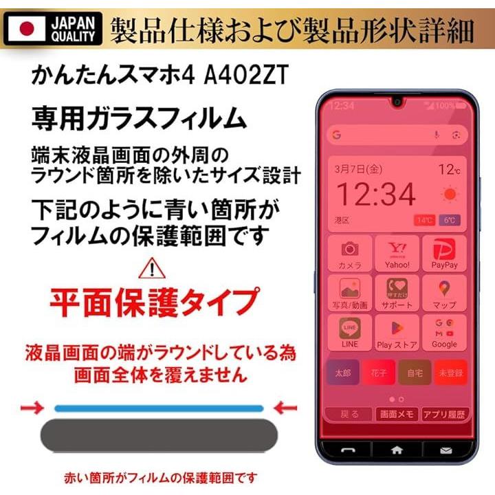 2枚セット強化モデル フィルム かんたんスマホ4 A402ZT 用 ガラスフィルム ブルーライトカット 93% 保護フィルム 高透過 高光沢 日本製 旭硝子 硬度10H 2.5Dラウンドエッジ 自動吸着 気泡ゼロ