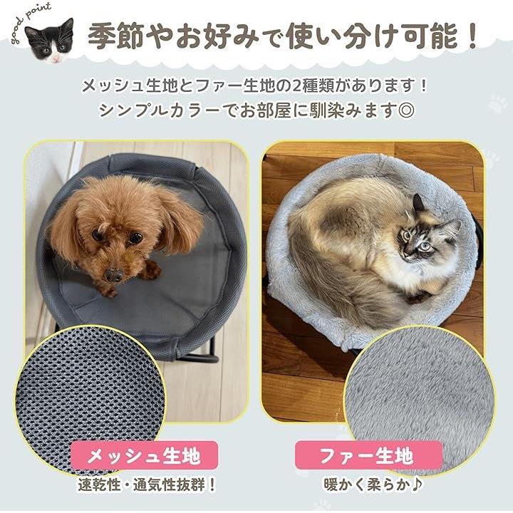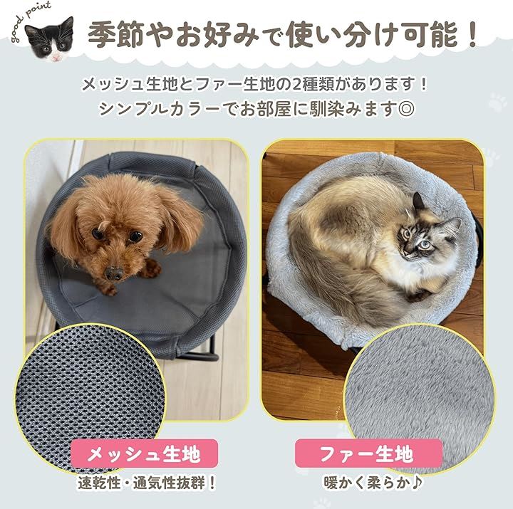 速乾性のあるメッシュ生地と暖かく柔らかい肌触りのファー生地の2種類があり、季節やお部屋の雰囲気、ペットの好みに合わせて使い分けができます。