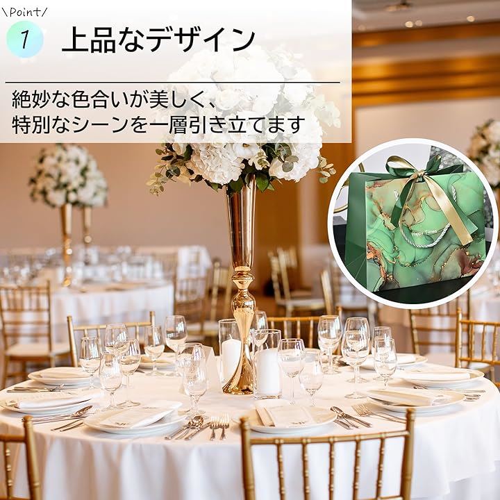 ゴールドやグリーンの絶妙な色合いが美しく、特別なシーンを一層引き立てます。