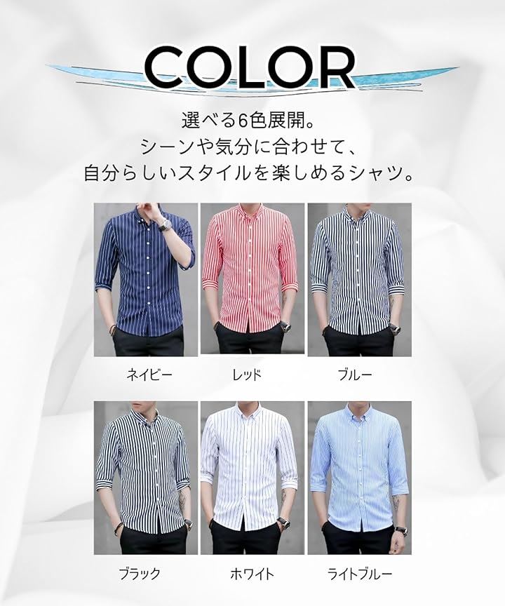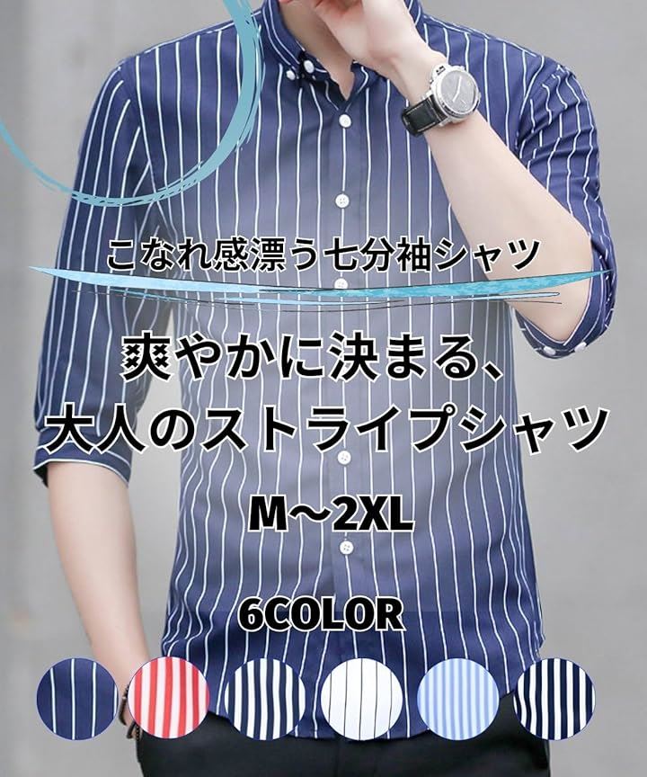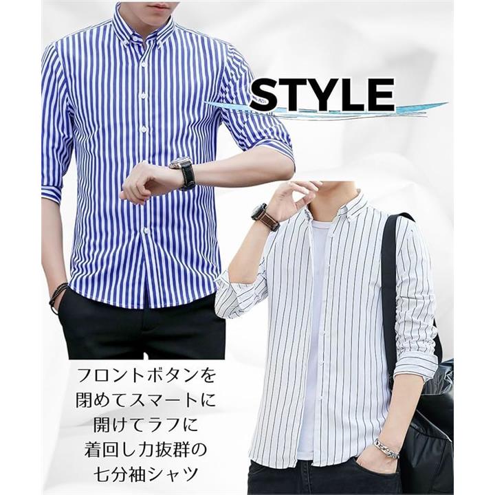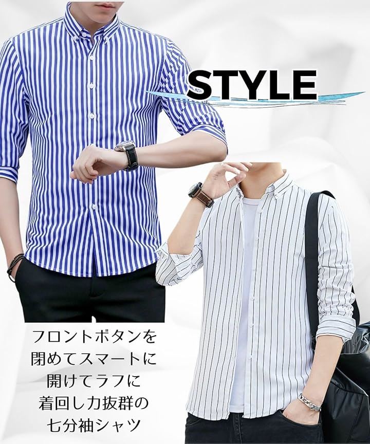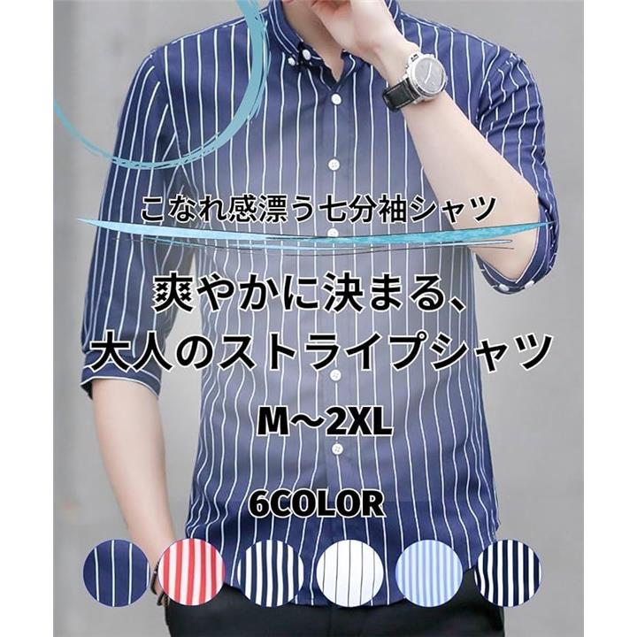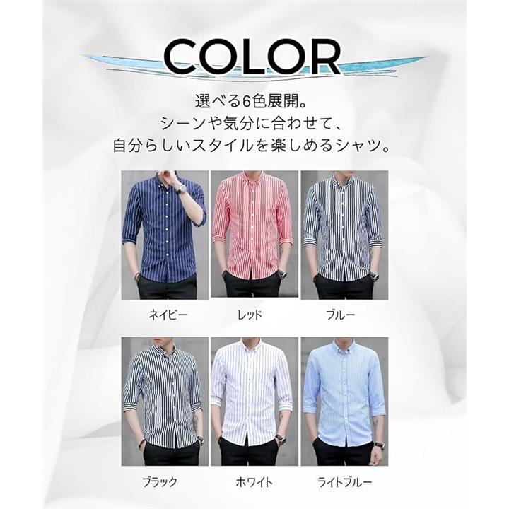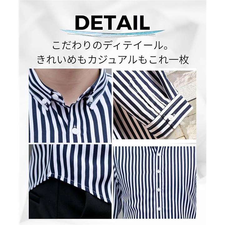 [Four leaf] スリムシルエット ストライプ シャツ メンズ 7分袖 七分袖 襟付きシャツ ボタンダウン ポリエステル ノンアイロン 薄手 ポケット |