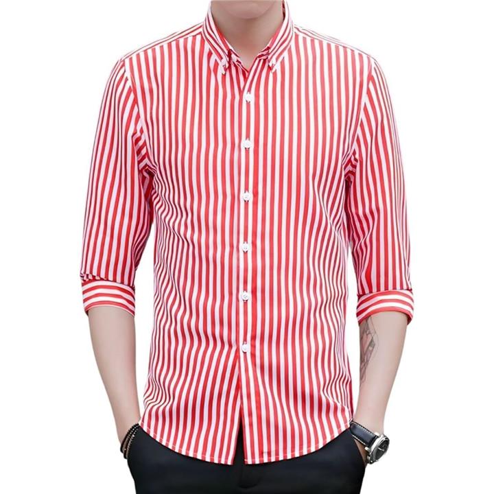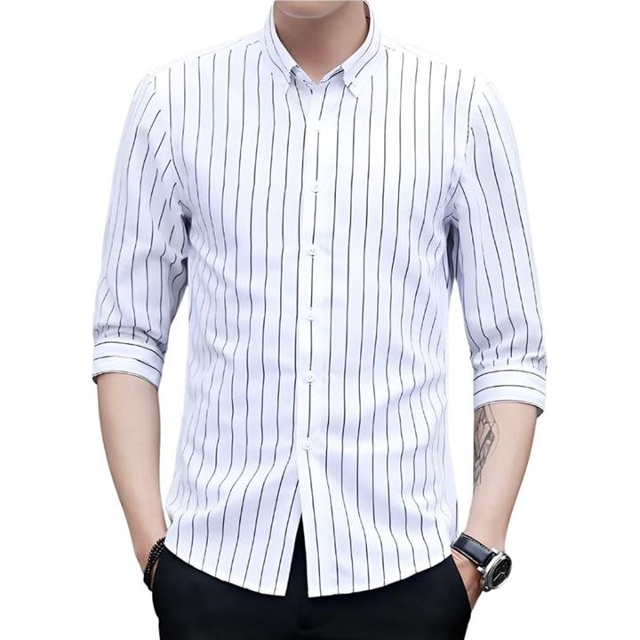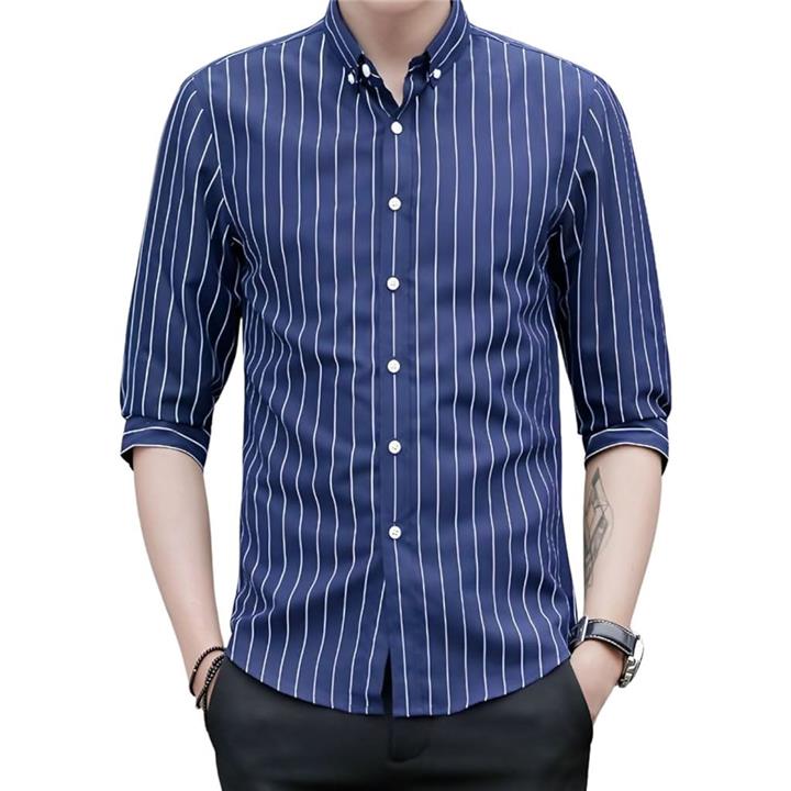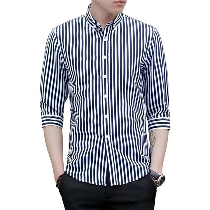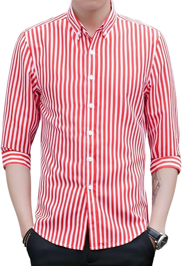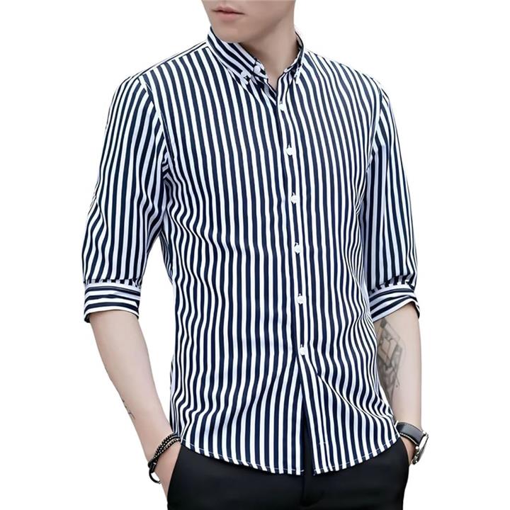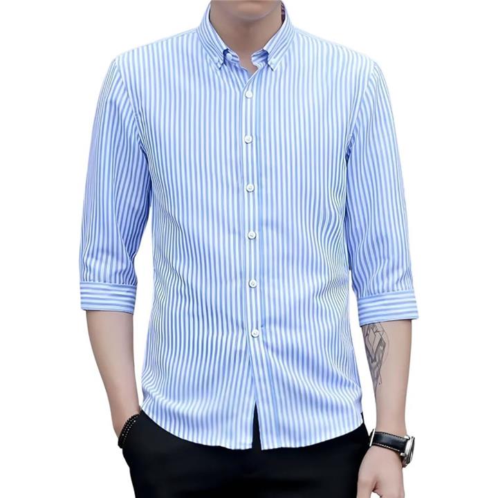 [Four leaf] スリムシルエット ストライプ シャツ メンズ 7分袖 七分袖 襟付きシャツ ボタンダウン ポリエステル ノンアイロン 薄手 ポケット |