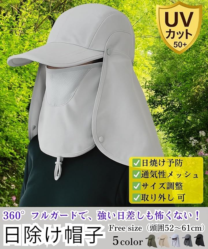 「これ一つで顔周りカバー」顔、首、耳周りまで360°しっかり紫外線をガードするレディース向けの日除け帽子です 。