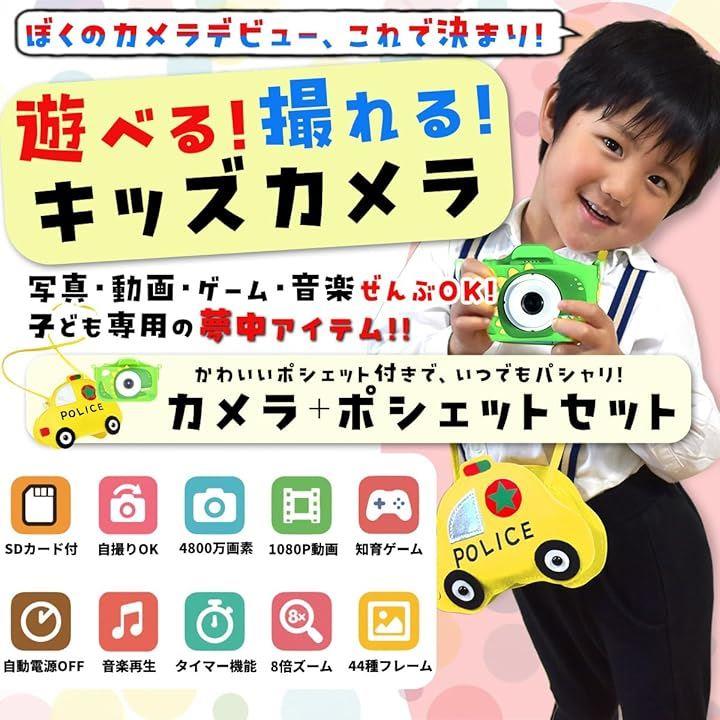 64GB ポシュエット付きキッズカメラ トイ 子供用 ゲーム機能 音楽プレーヤー 8倍ズーム ひらがな説明書付き 恐竜 男の子 プレゼント