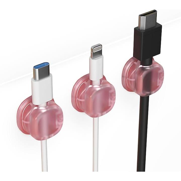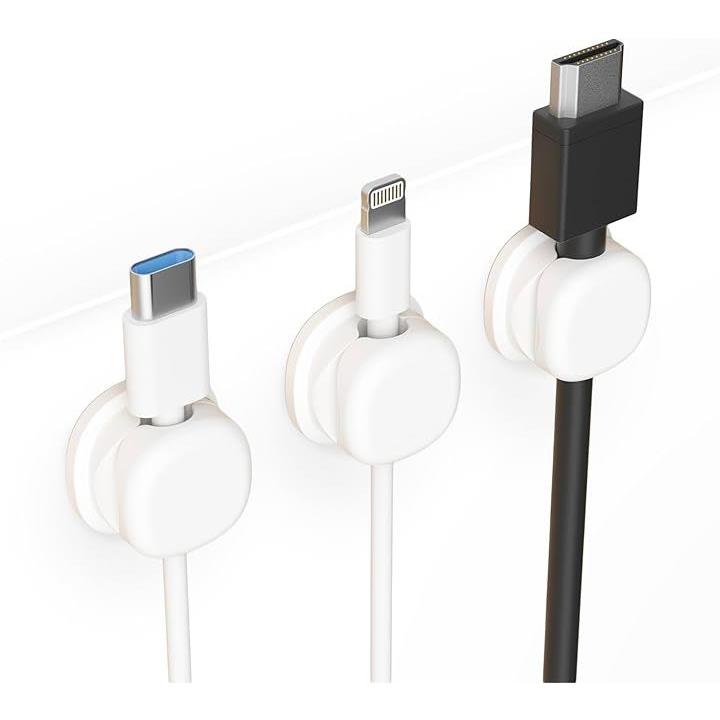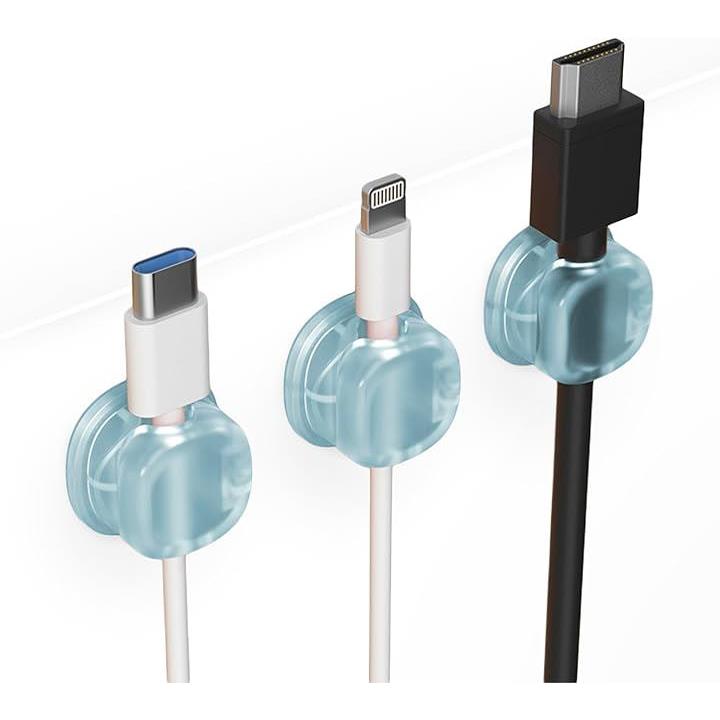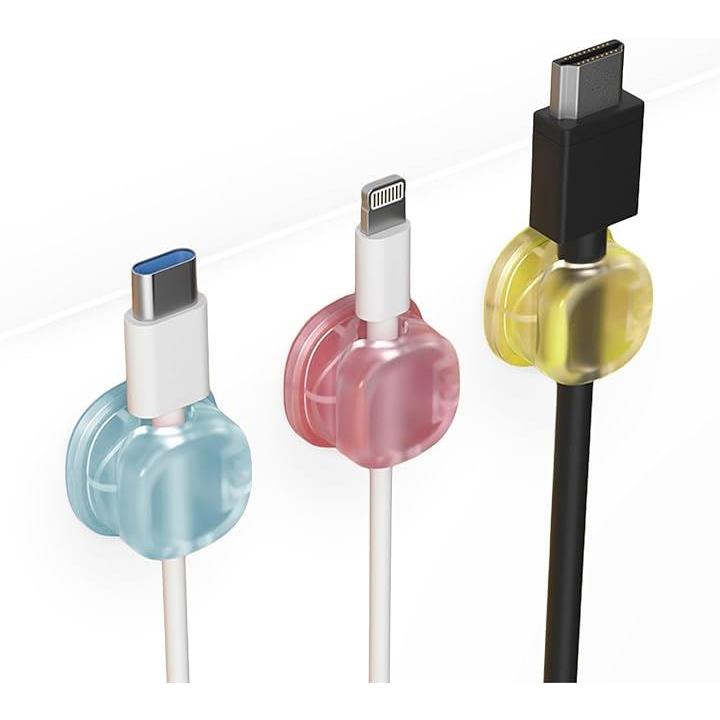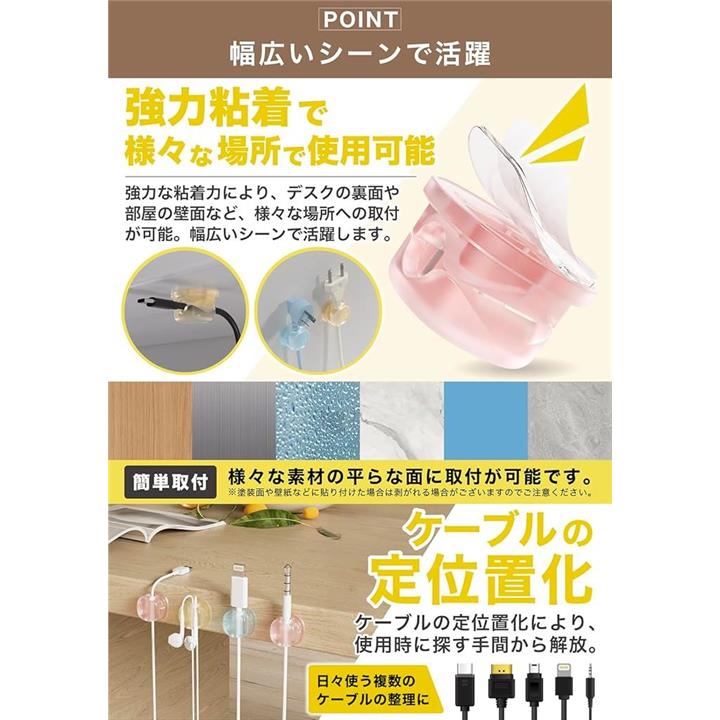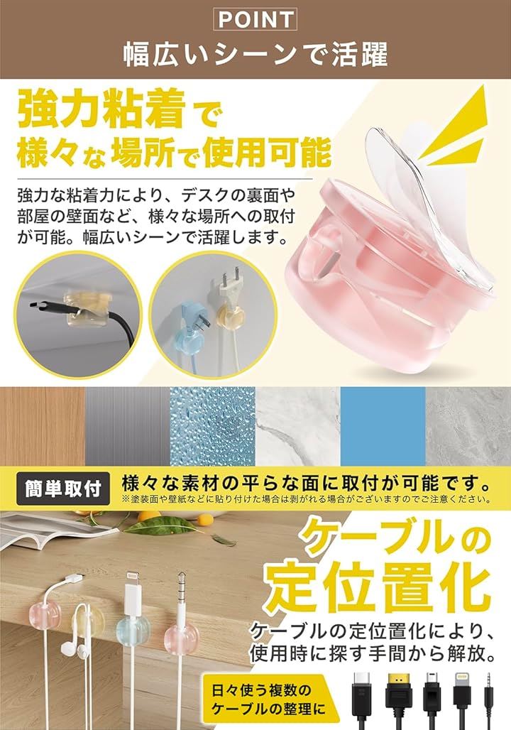「強力固定xスマート整理。頼れるコンパクトケーブルホルダー」 超強力粘着で木製・ガラス・車内にもがっちり固定。狭い隙間にもフィットするスリム設計で、ごちゃつきを一掃。