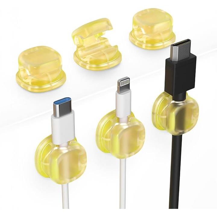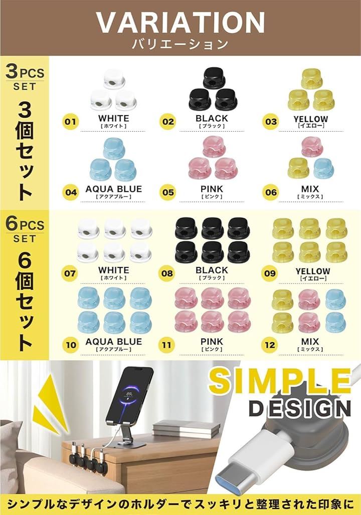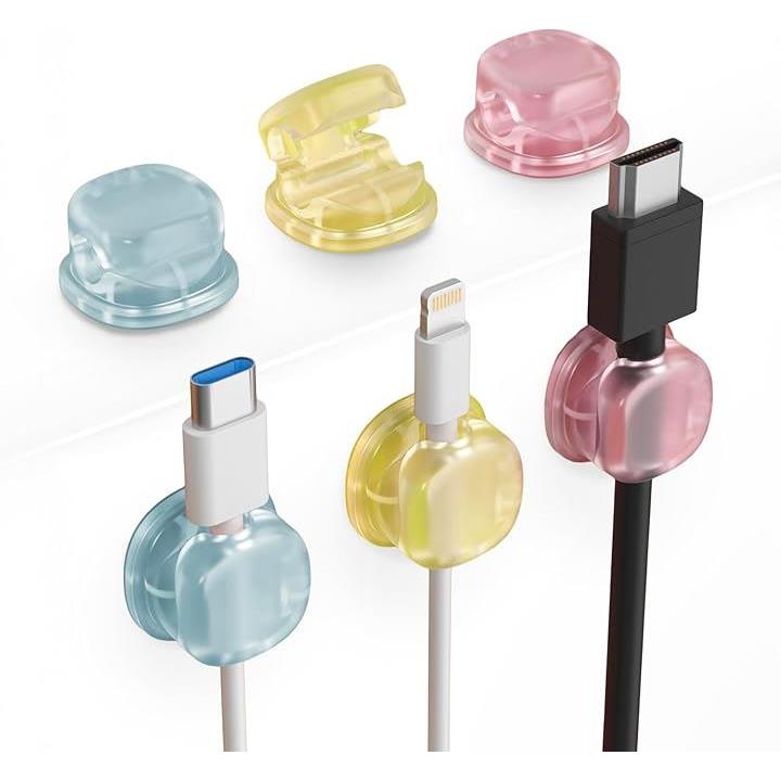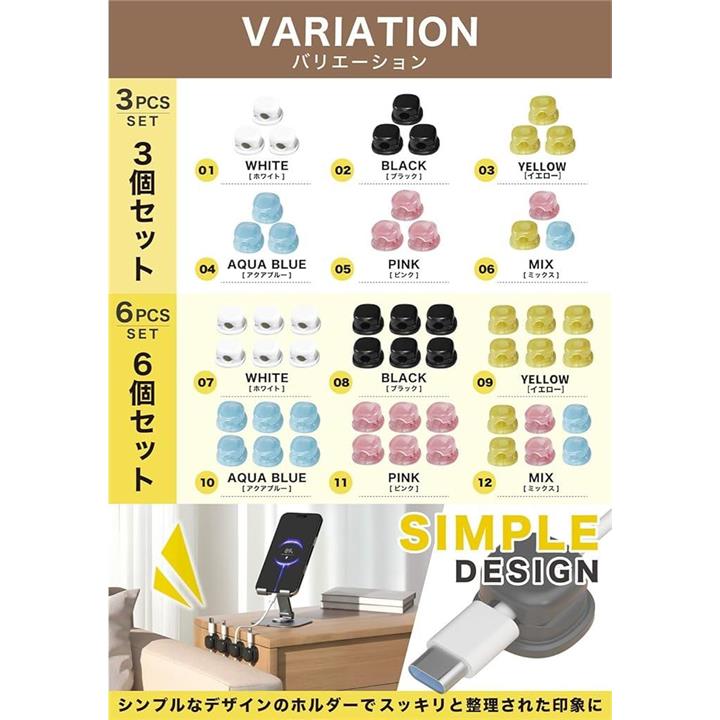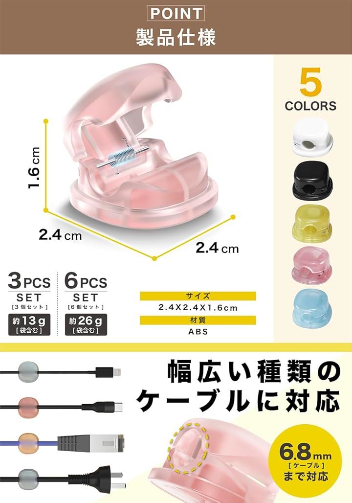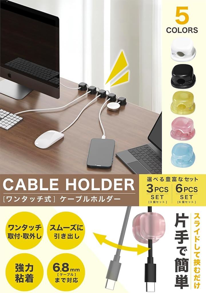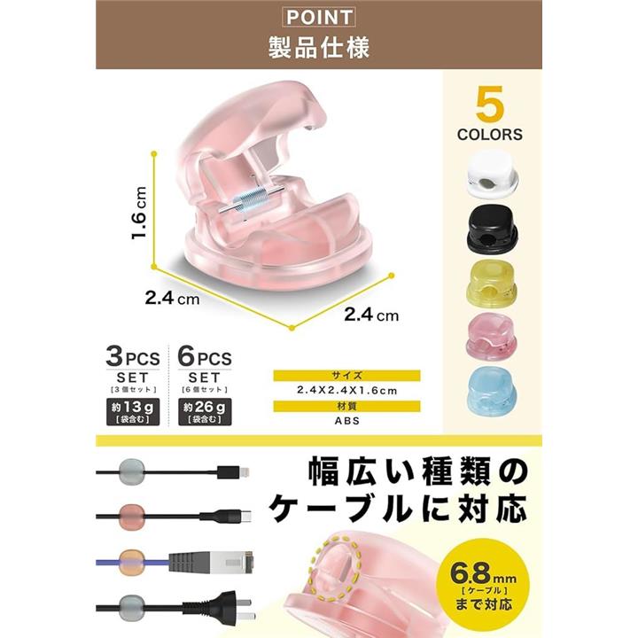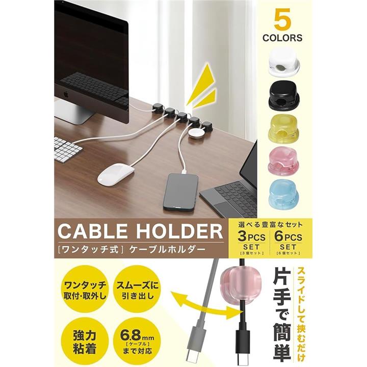 「製品仕様」 片手で簡単ワンタッチ バネ式ホルダー:2.4x2.4x1.6cm ケーブルスロットφ7mm 各色3個と6個のセット ブラック、ホワイト、 イエロー 、アクアブルー、 ピンク、 ミックスカラー ABS+バネ 粘着両面テープ