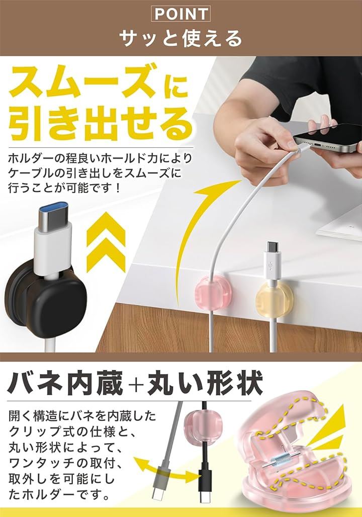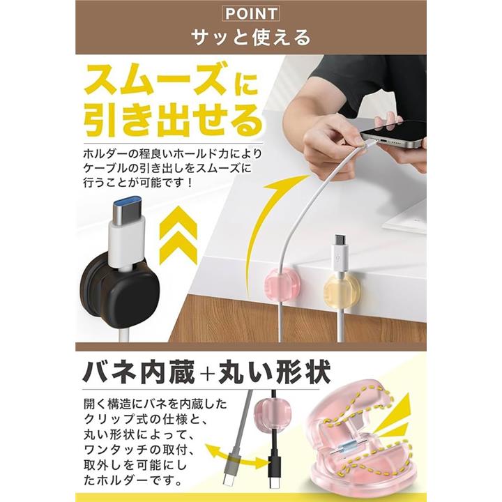[VIVRELLA] ケーブルホルダー バネ式 コードホルダー クリップ USBケーブル ワンタッチ 粘着式 壁 デスク 配線整理 |