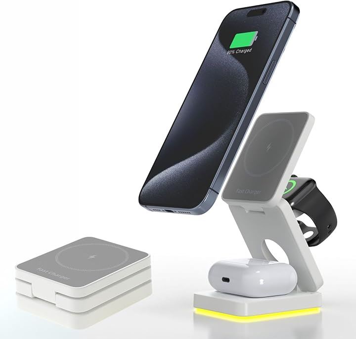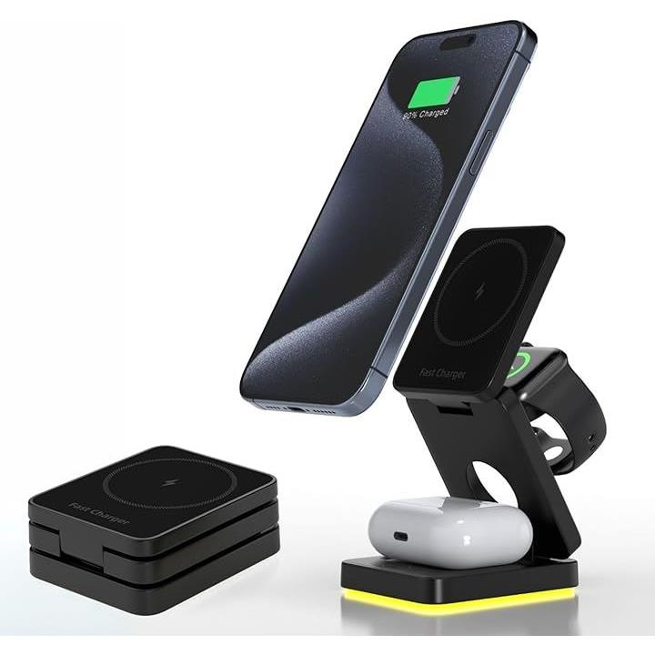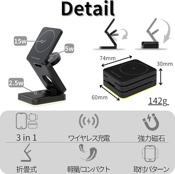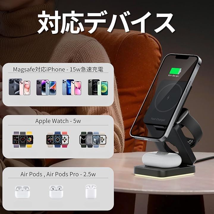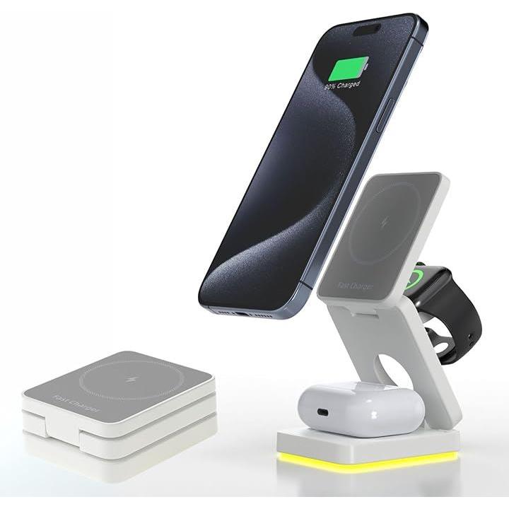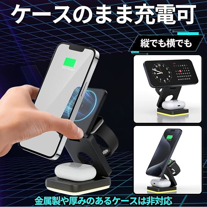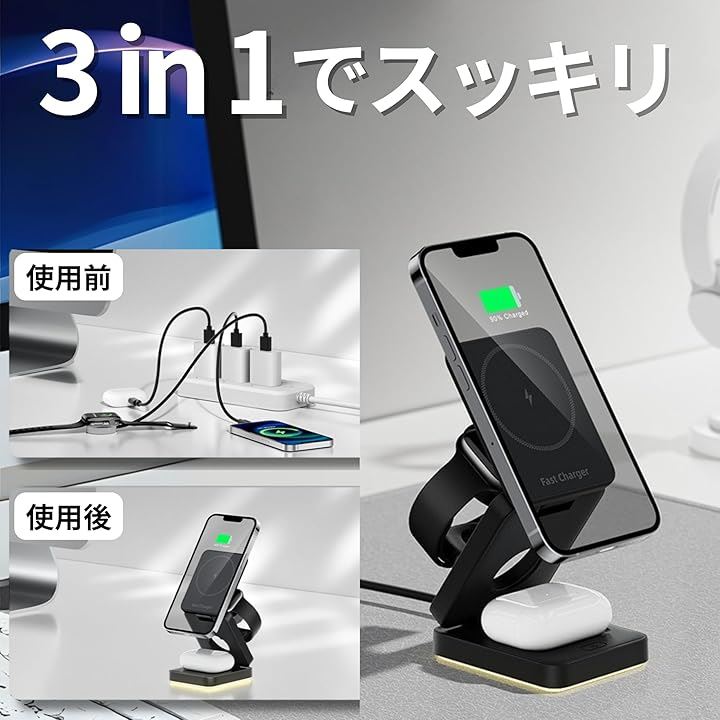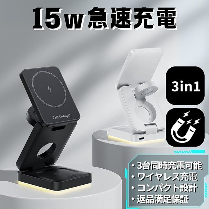 互換品ワイヤレス充電器 3in1 急速充電 マグネット式 iPhone/AirPods/Apple Watch 対応 3台同時 充電スタンド 折りたたみ式 軽量 コンパクト出張 旅行用