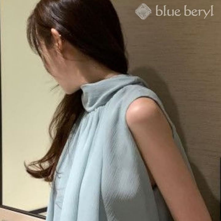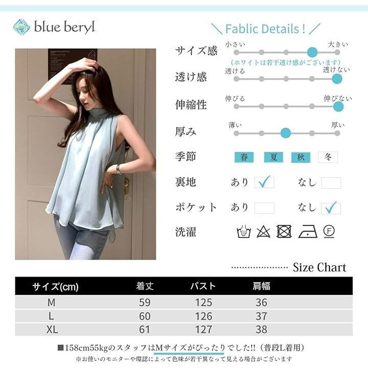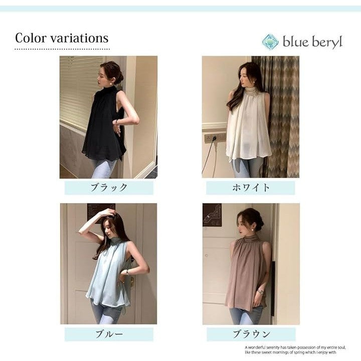 [ブルーベリル] シフォンブラウス レディース ギャザーブラウス ノースリーブ スタンドカラー バックリボン 裏地 スリーブレスハイネック BB078 |