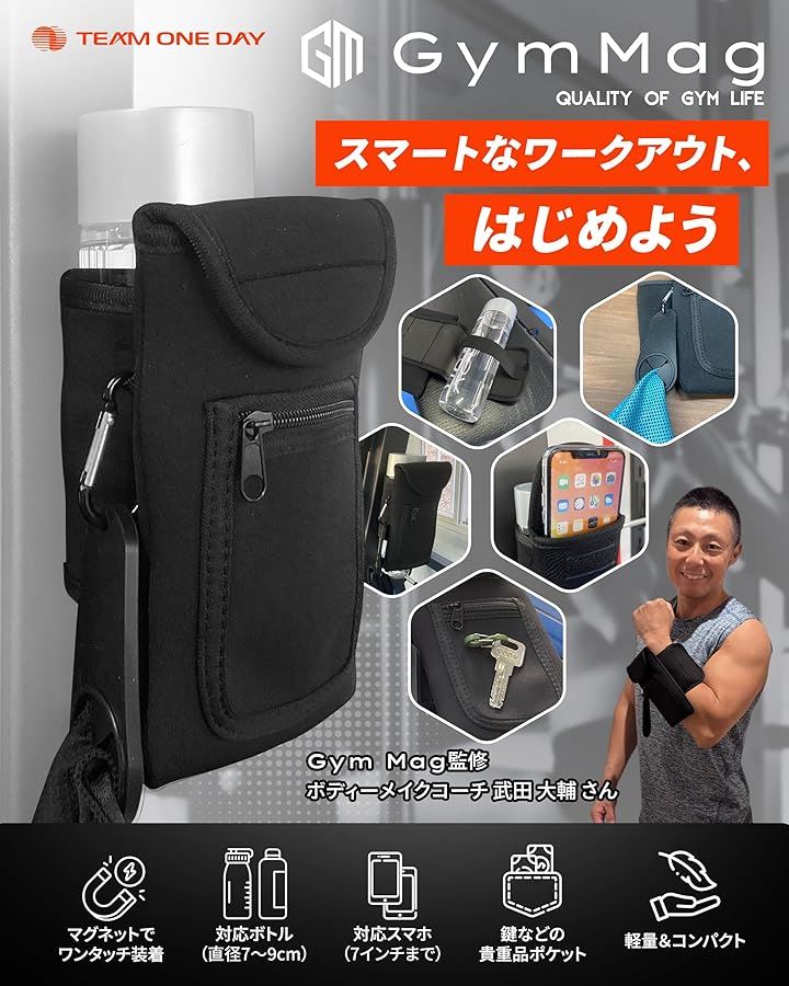 TeamOneDay ボディーメイクコーチ監修 GymMag ジムバッグ 小さめ 軽量 ドリンクホルダー 強力マグネット ボトル スマホ タオル メンズ レディース ミニ ギフトに最適