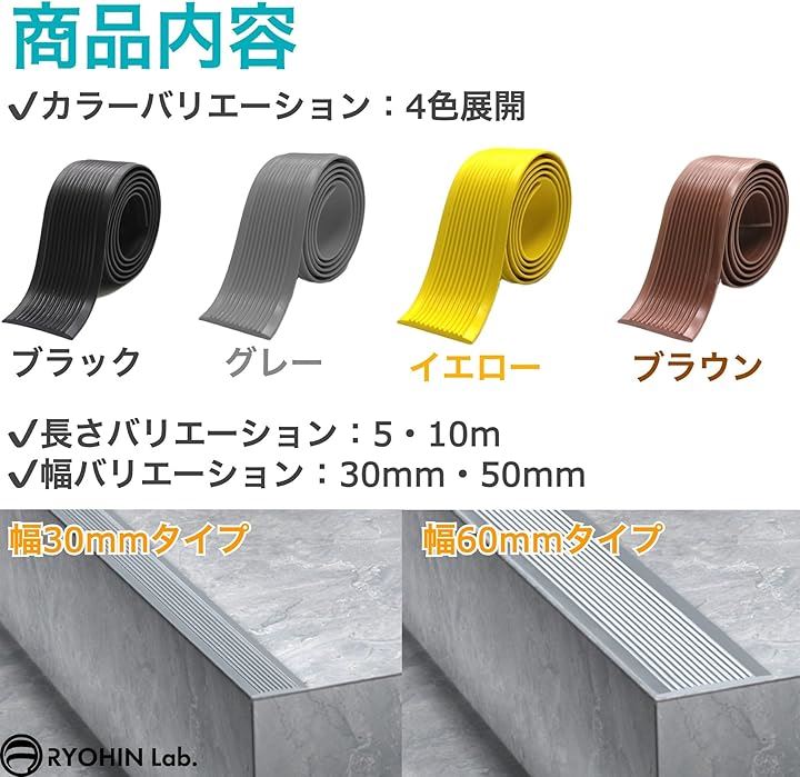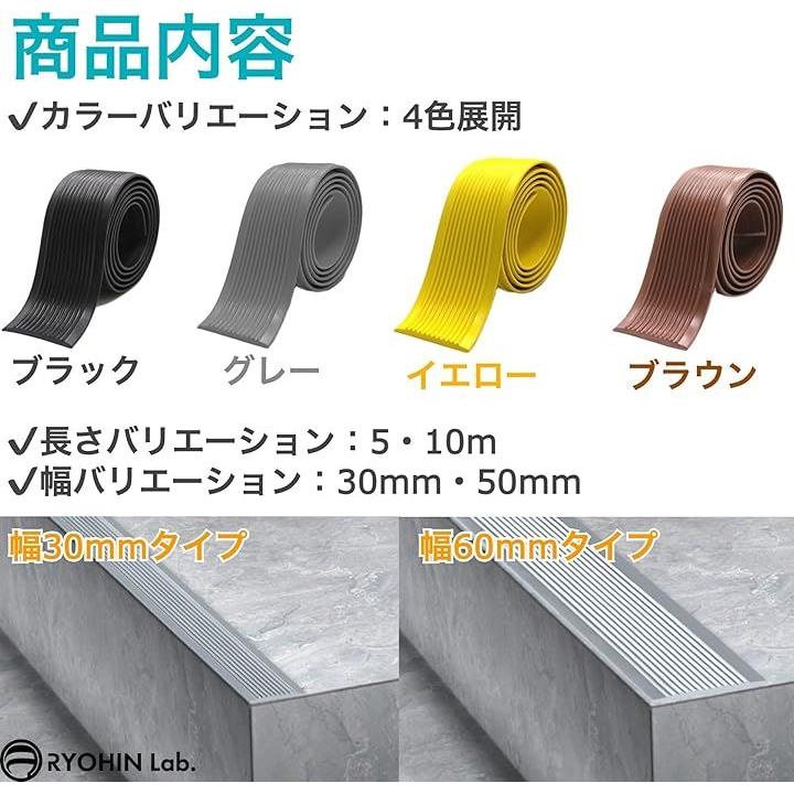 「商品内容」滑り止めテープ1巻、長さバリエーション:5・10m、幅バリエーション:30mm・50mm、カラーバリエーション:ブラウン・ブラック・グレー・イエロー、材質:PVC(粘着テープタイプ)