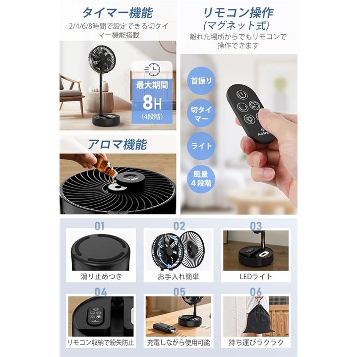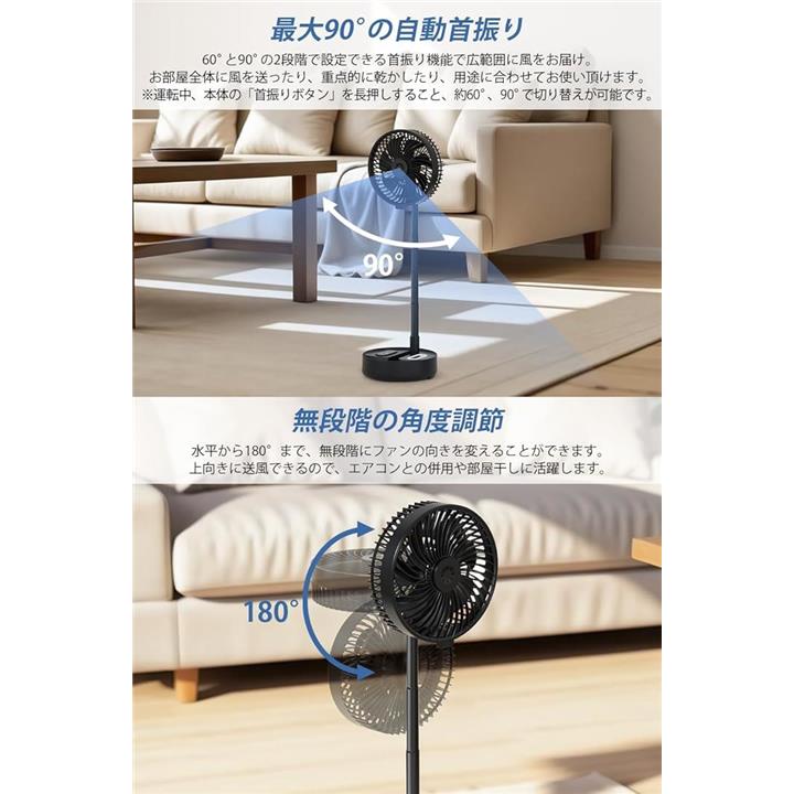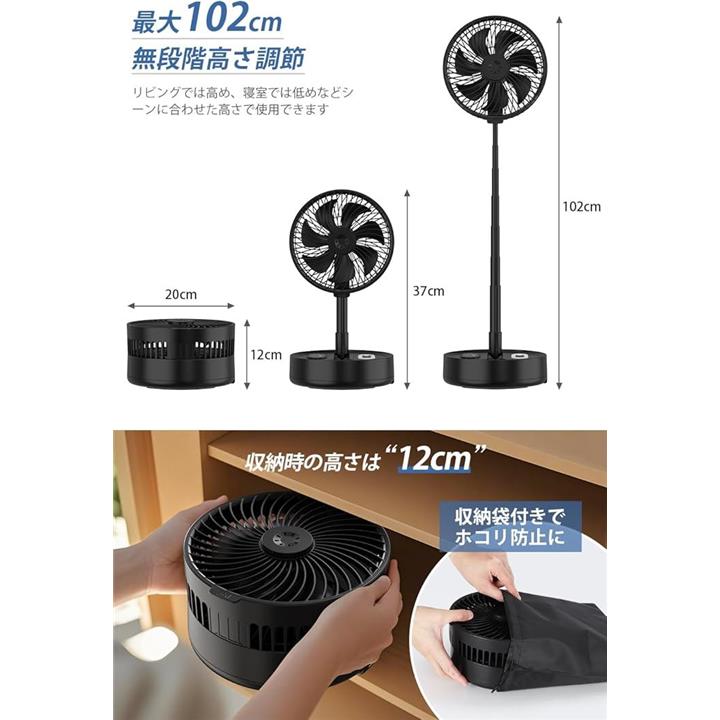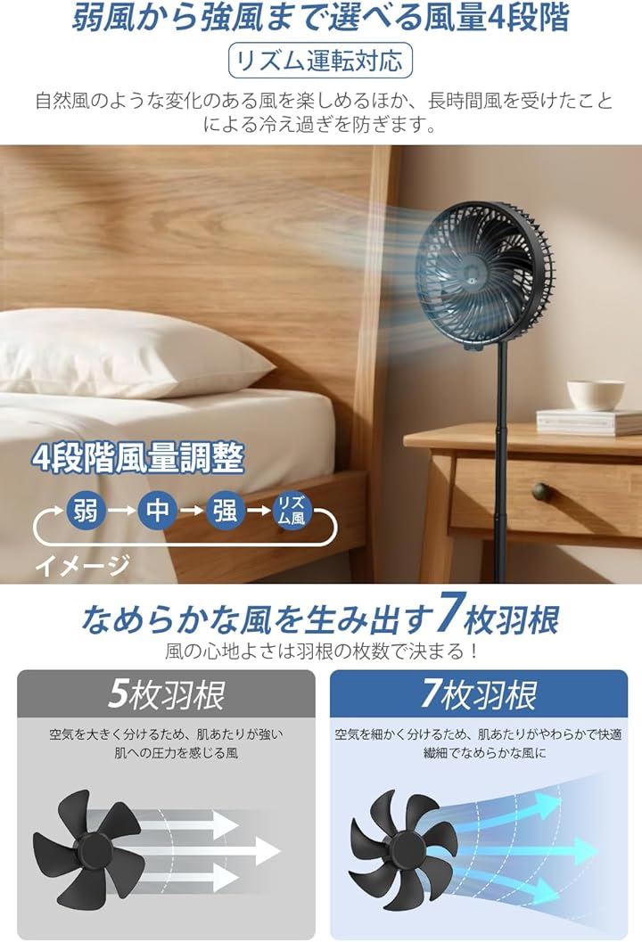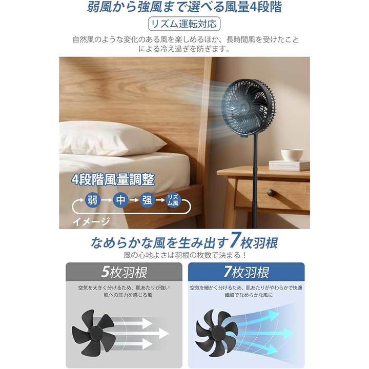 コードレス扇風機 7200mAh USB充電式 折りたたみ扇風機 コードレス|首振り・風量4段階・リズム自然風・タイマー機能付き|高さ無段階調節・コンパクト収納・静音・省エネ DC モーター搭載