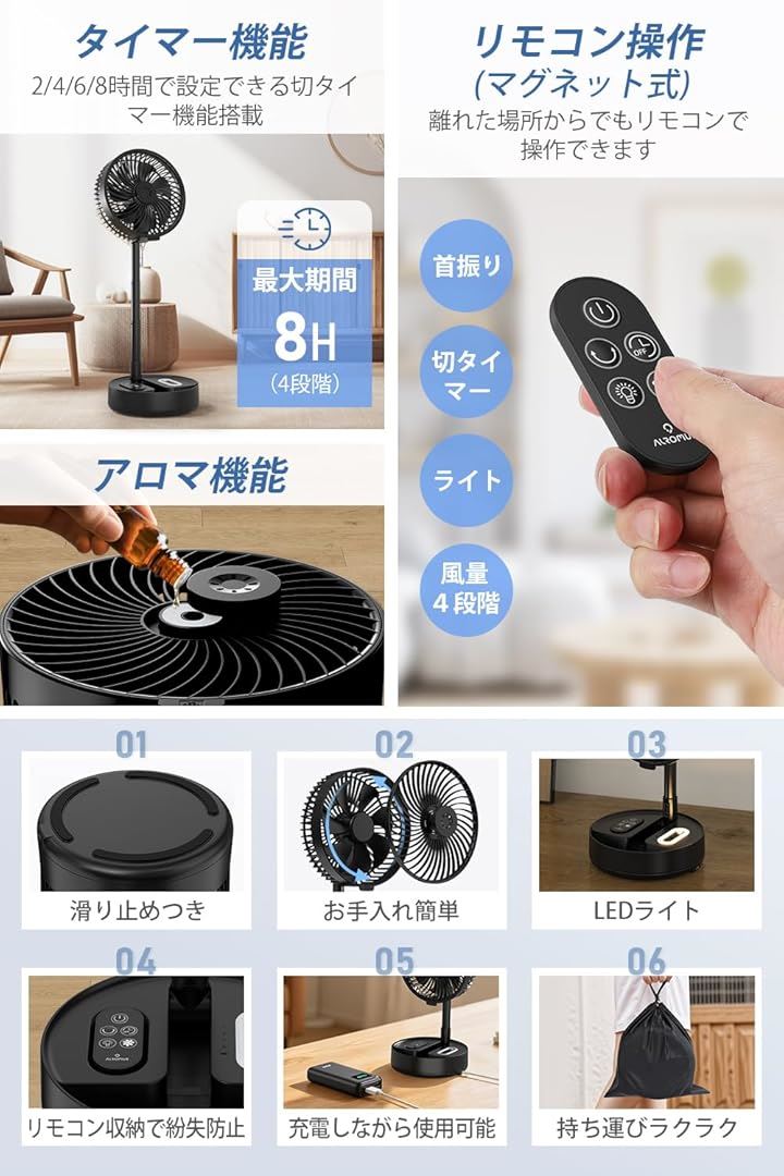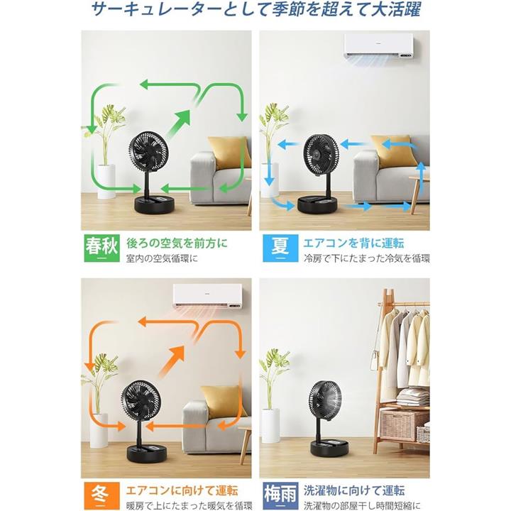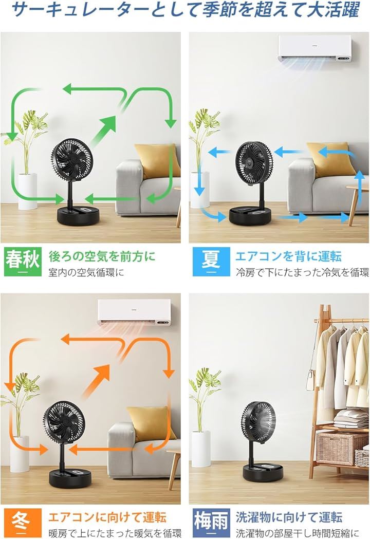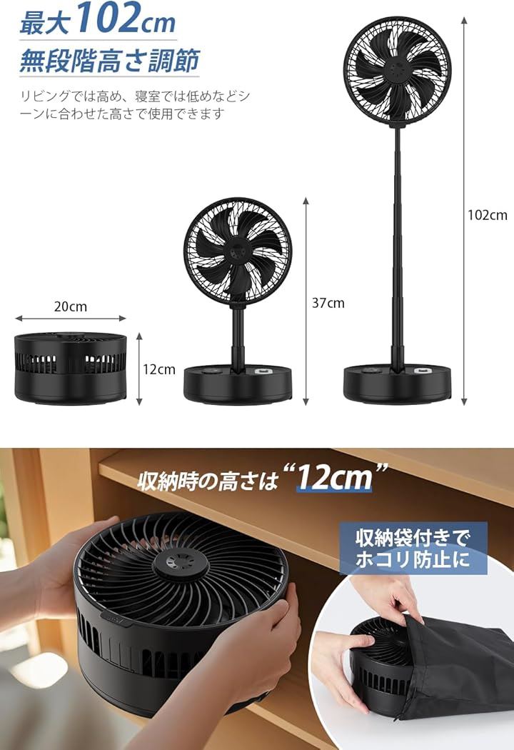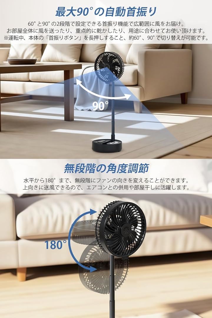 コードレス扇風機 7200mAh USB充電式 折りたたみ扇風機 コードレス|首振り・風量4段階・リズム自然風・タイマー機能付き|高さ無段階調節・コンパクト収納・静音・省エネ DC モーター搭載