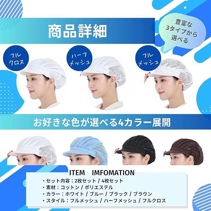 「商品詳細」サイズ:フリーサイズ(頭囲55~62cm) セット内容:2枚セット / 4枚セット 素材:コットン / ポリエステル カラー:ホワイト / ブルー / ブラック / ブラウン スタイル:フルメッシュ / ハーフメッシュ / フルクロス *製造時のにおいが気になる場合は、軽く洗濯してから風通しの良い場所で陰干ししていただくと、より快適にお使いいただけます。