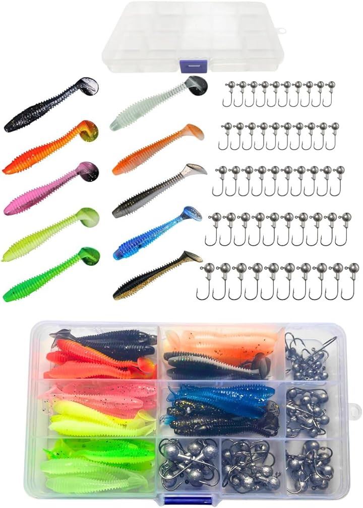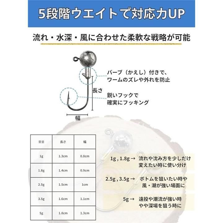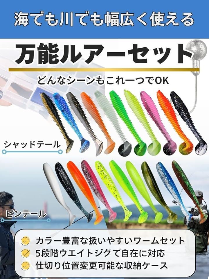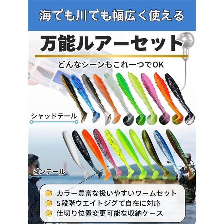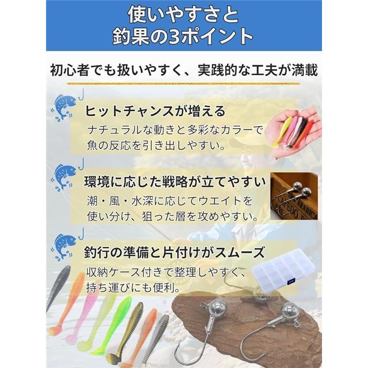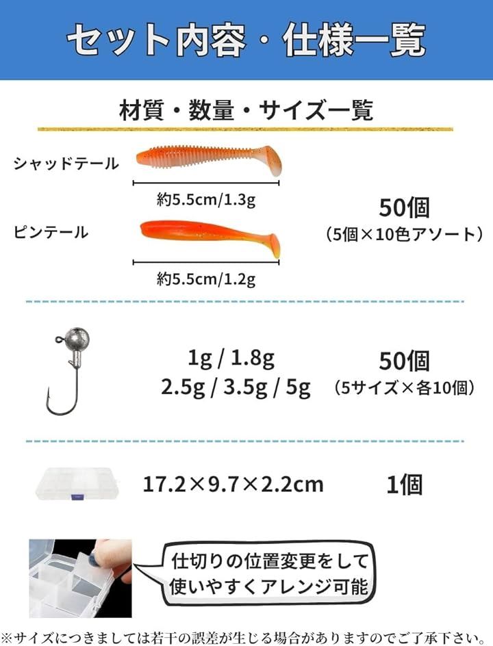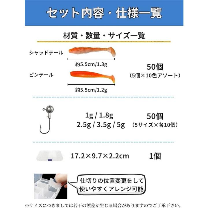 「商品仕様」〇セット内容:ワーム50個(5.5cm、10色アソート)、ジグヘッド50個(1g、1.8g、2.5g、3.5g、5g 各10個)、収納ケース1個。