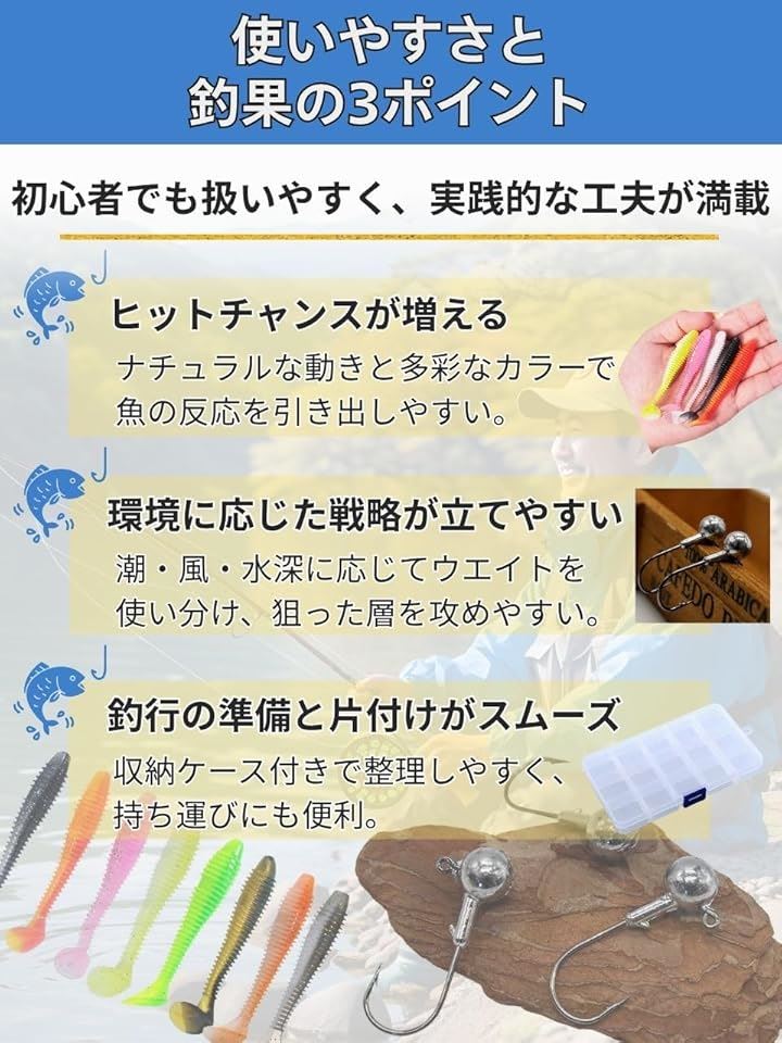 ワーム50個とジグヘッド50個に収納ケースが付属しており、初めてのルアー釣りにも扱いやすい構成です。
