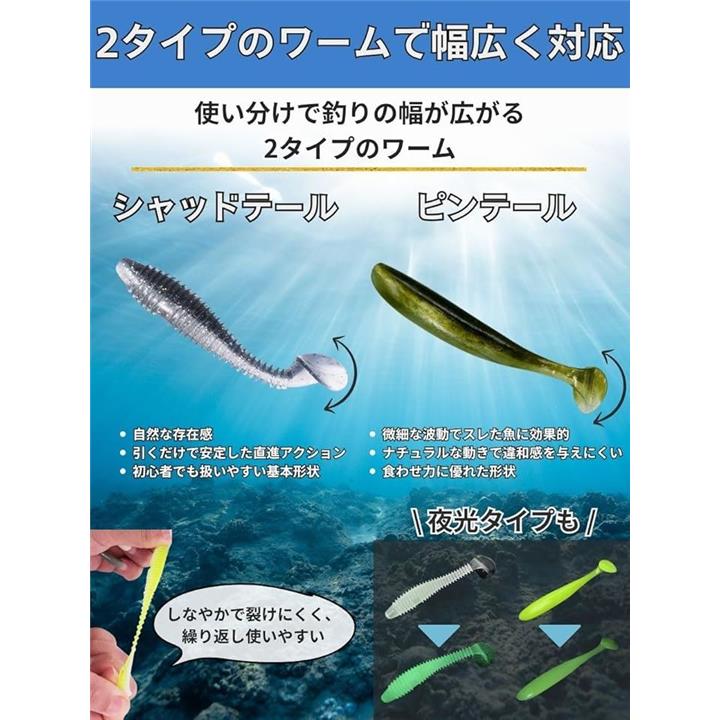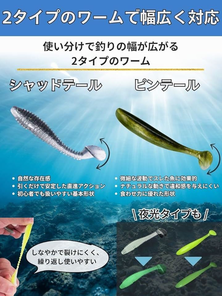 「実釣性能を高めるシャッドテールワームとナチュラルアクションのピンテールワーム」セットに含まれるワームは、シャッドテールとピンテールの2種類のワームタイプなります。