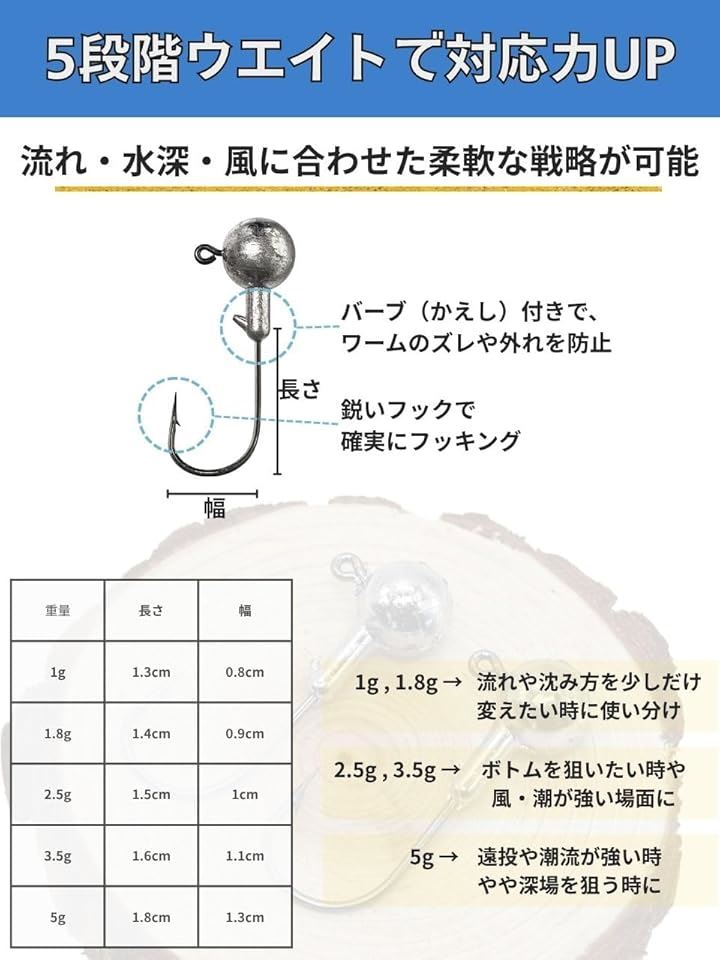 ジグヘッドは各サイズ均等に入っており、ショア、ボート問わず、様々なシーンに幅広く対応します。