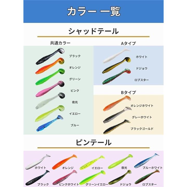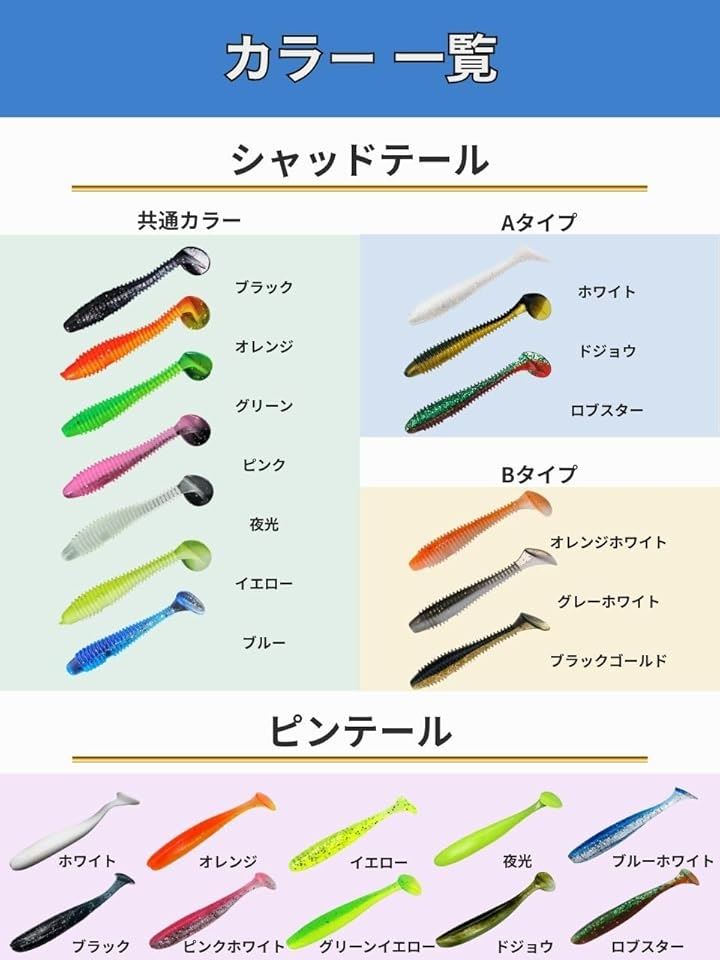 〇バリエーション>(1)シャッドテールAタイプ : ワームカラー(ホワイト、ブラック、オレンジ、ピンク、イエロー、グリーン、夜光、ドジョウ、ブルー、ロブスター)、(2)シャッドテールBタイプ : ワームカラー(ブラック、オレンジ、ピンク、イエロー、グリーン、夜光、オレンジホワイト、グレーホワイト、ブルー、ブラックゴールド)、(3)ピンテール: ワームカラー(ホワイト、ブラック、オレンジ、ピンクホワイト、イエロー、グリーンイエロー、夜光、ドジョウ、ブルーホワイト、ロブスター)。