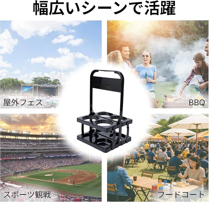 缶、ペットボトル、紙コップ、ビール瓶などをまとめて持ち歩けるので、フードコートやスポーツイベント、屋外フェスでも活躍。
