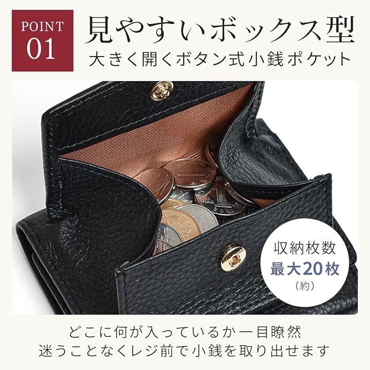 外側には取り出しやすいボックス型の小銭入れを備え、小銭はもちろん鍵などの小物類もすっきり収納可能。