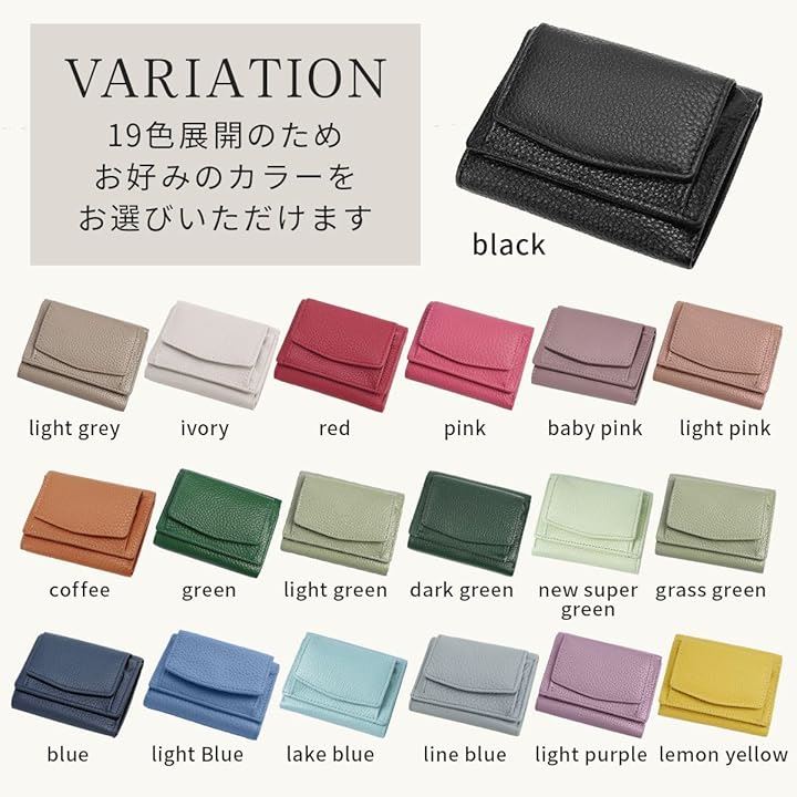 「豊富なカラーバリエーション|プレゼントにも最適」こちらの三つ折りミニ財布は、豊富な19色のカラーバリエーションからお選びいただけるのが大きな魅力。