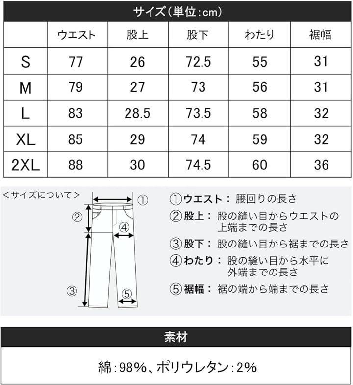 「2XL」ウエスト88 / 股上30 / 股下74.5 / わたり60 / 裾幅36