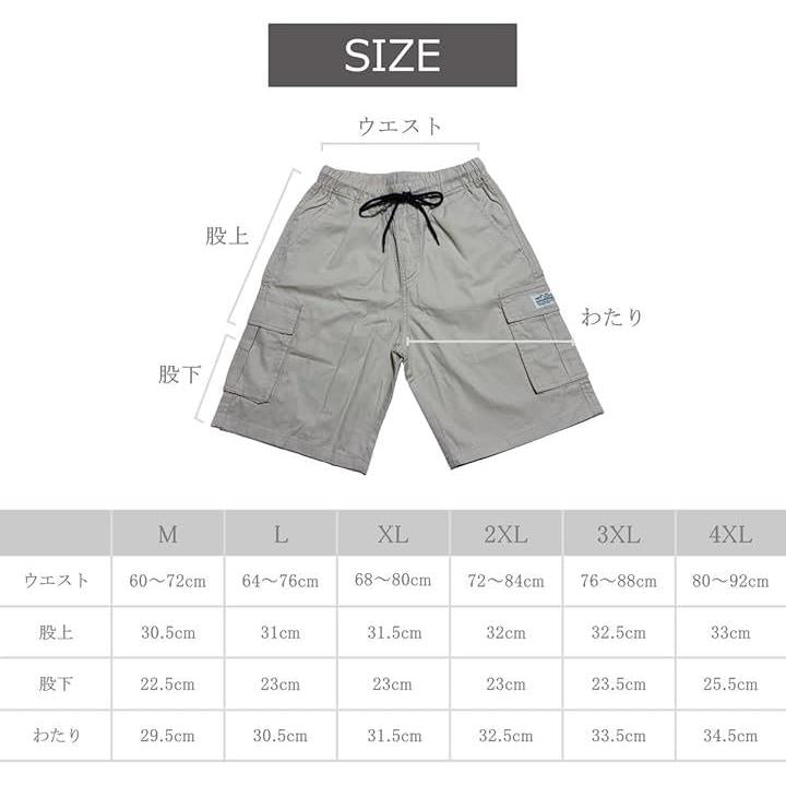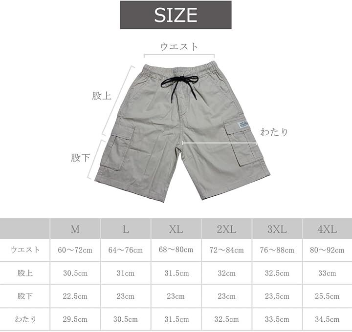 「サイズ」「M」ウエスト60~72/ 股上30.5 / 股下22.5 / わたり59・「L」ウエスト64~76/ 股上31 / 股下23 / わたり61・「XL」ウエスト68~80 / 股上31.5 / 股下23 / わたり63・「2XL」ウエスト72~84 / 股上32 / 股下23 / わたり65・「3XL」ウエスト76~88 / 股上32.5 / 股下23.5 / わたり67・「4XL」ウエスト80~92 / 股上33 / 股下25.5 / わたり69 *サイズに多少の誤差がある場合がございます。