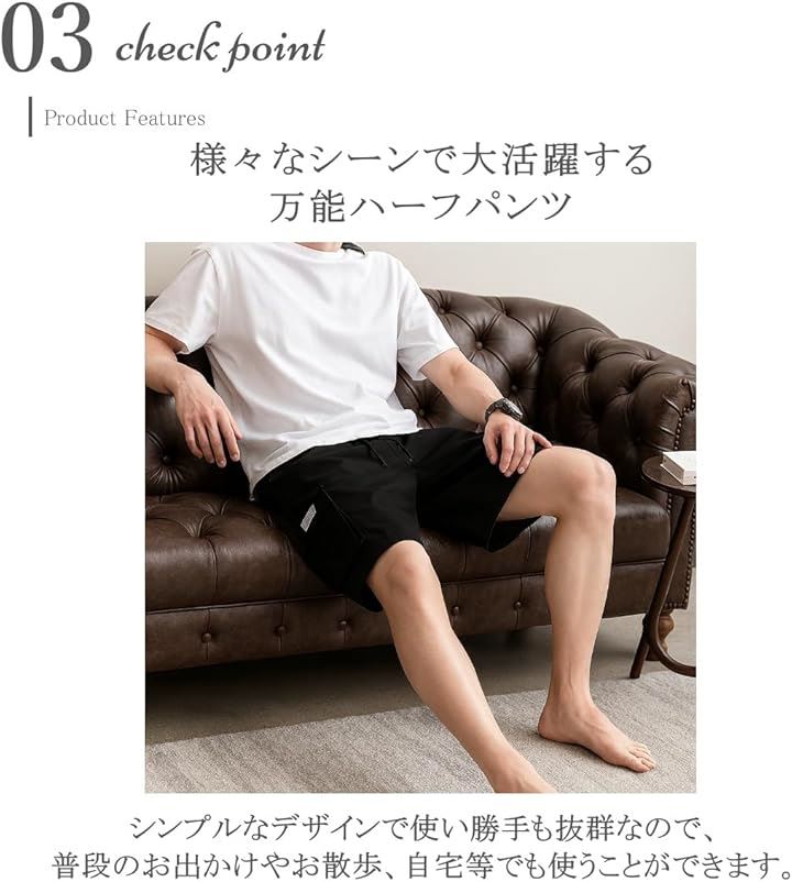 「様々なシーンで大活躍。」履き心地が良くシンプルなデザインで使い勝手も抜群なので、普段のお出かけやお散歩、自宅等で使うことができ、旅行などの特別なシーンでも大活躍するお洒落ハーフパンツです。