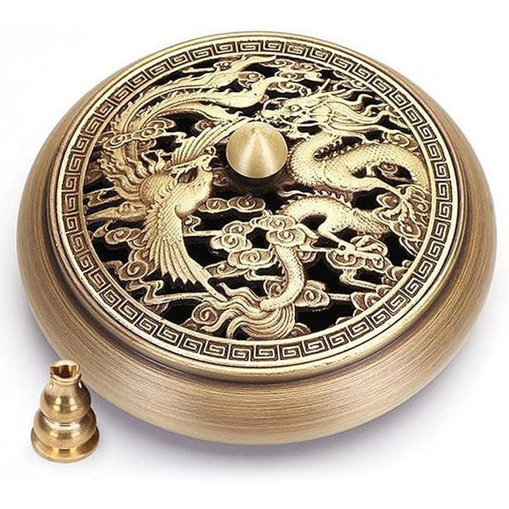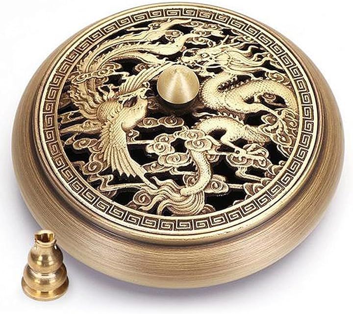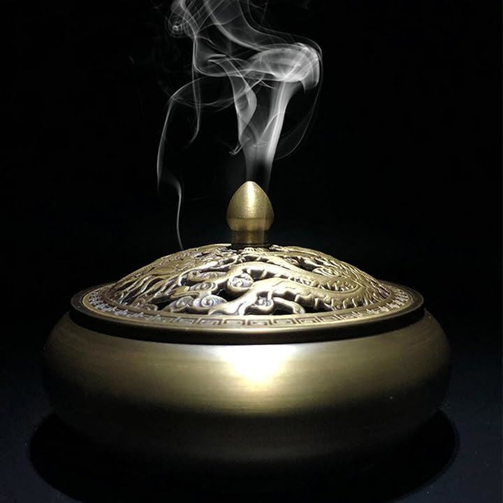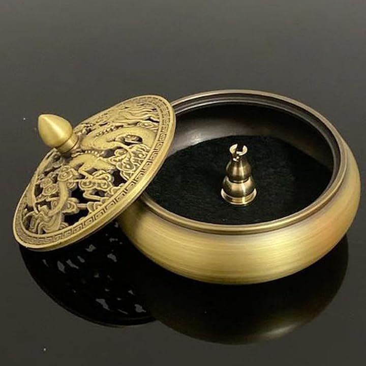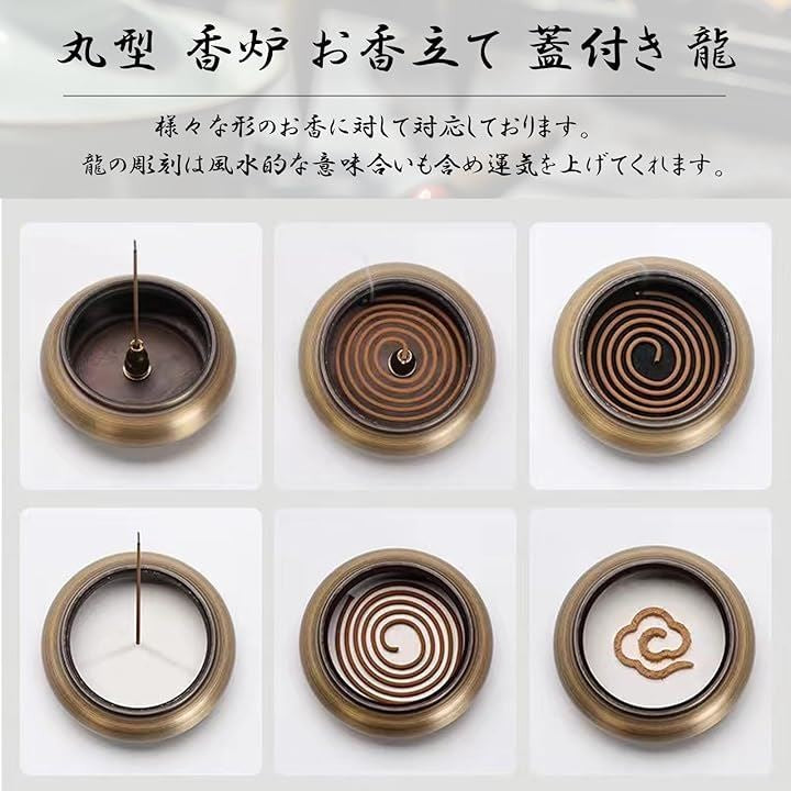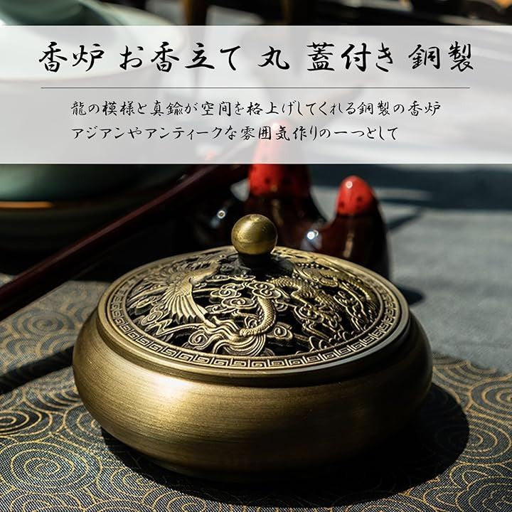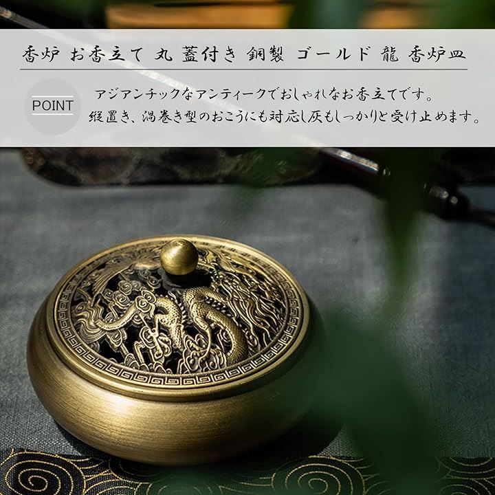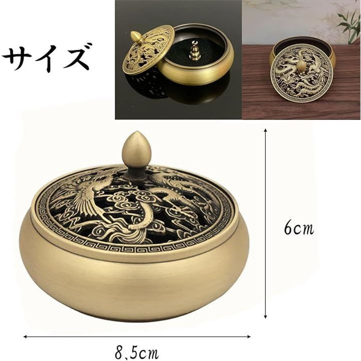 香炉 お香立て 丸 蓋付き 銅製 ゴールド 龍 香炉皿 アジアン アンティーク アロマ 真鍮