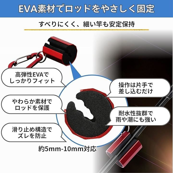 「EVA素材の滑り止め構造」ロッド保持部には高弾性EVA素材を使用し、竿径約5~10mmのライトロッドや渓流用タックルをしっかり支えます。
