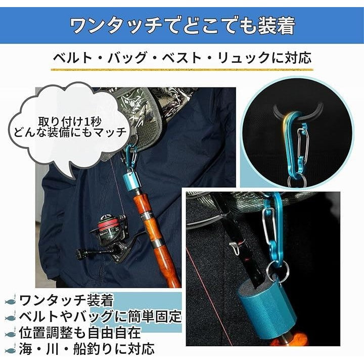 「両手を自由に使える便利なロッドホルダー」釣り竿をしっかり固定し、両手を自由に使えるカラビナ付きロッドホルダーです。