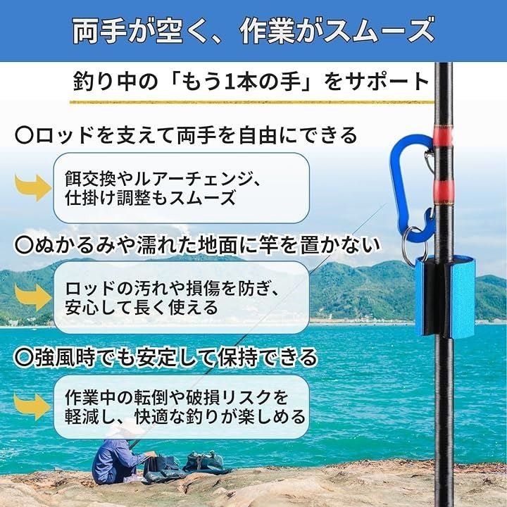 地面が濡れていたり砂浜が柔らかい場所でも、ロッドを宙に保持できるため、タックルを清潔に保ちながら作業効率を高められます。