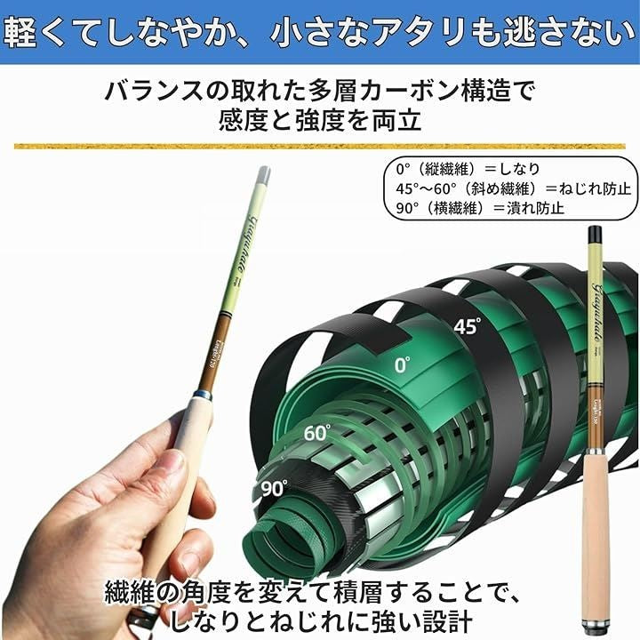 「カーボン採用で軽さとしなやかさを両立」部位ごとに適したバランスでカーボンを配置し、軽くスムーズな振り出しと、やり取り中の安定した曲がりを両立しています。