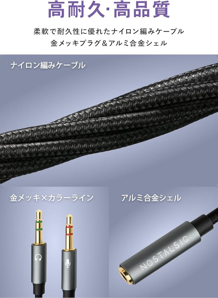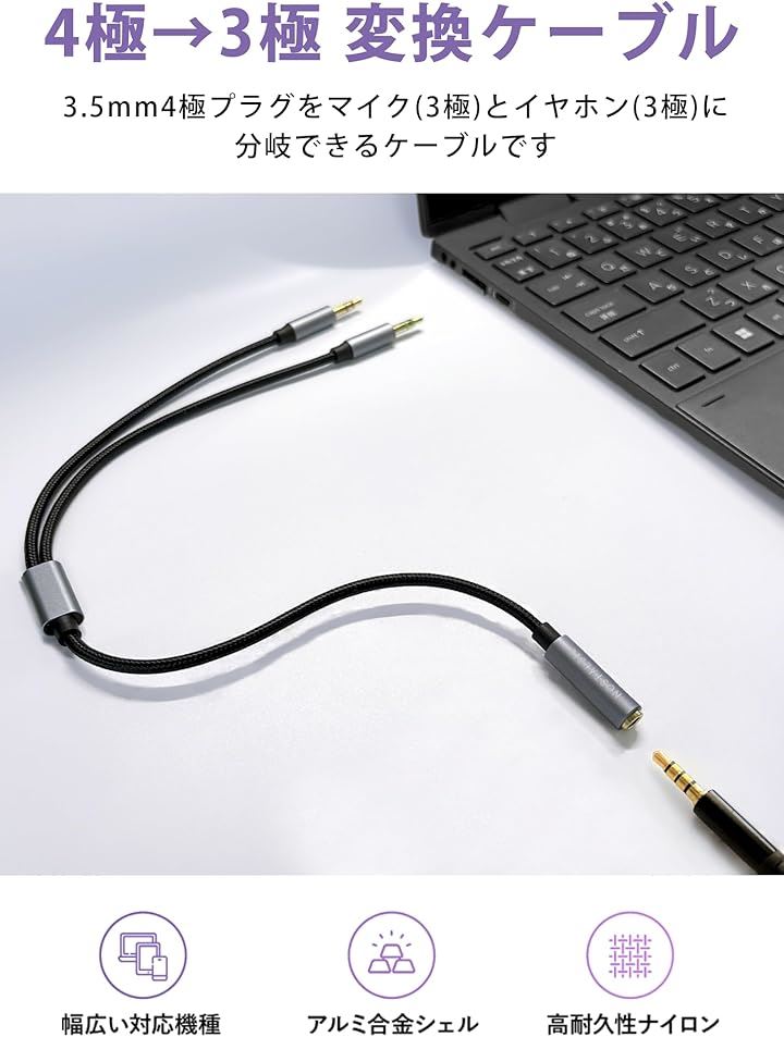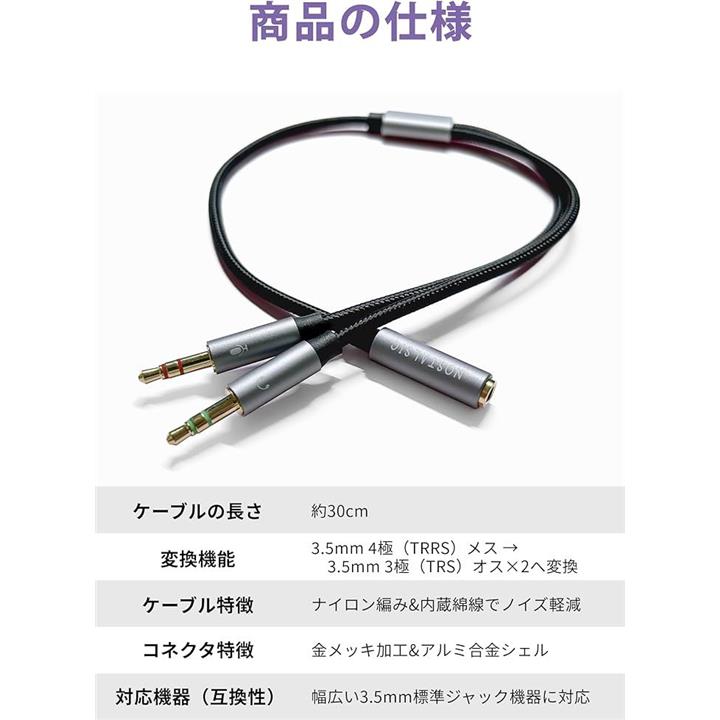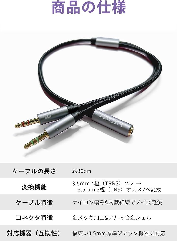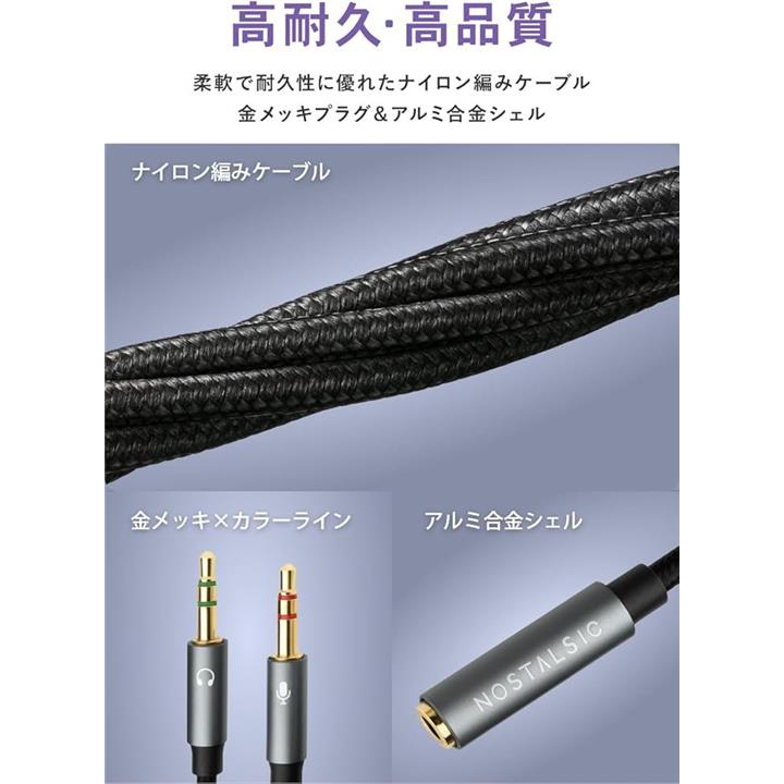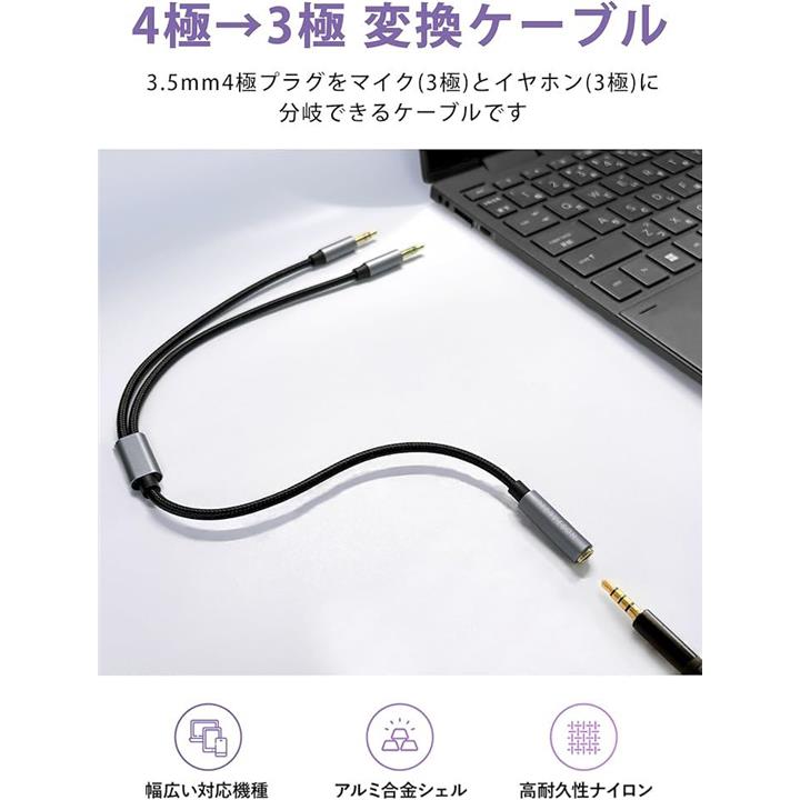 3.5mm 4極 3極 変換ケーブル ヘッドセット マイク 分岐 PC/ノートPC/ゲーム機対応 高耐久ナイロン編み 金メッキ端子 ノイズ低減 カラー識別端子 30cm