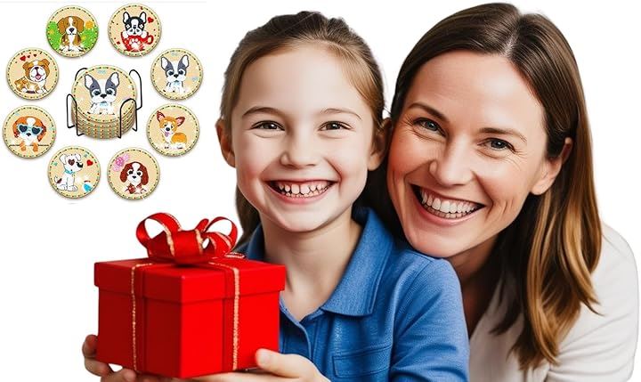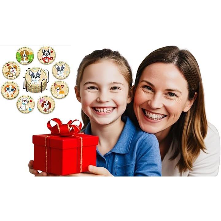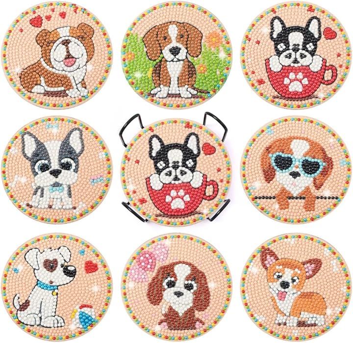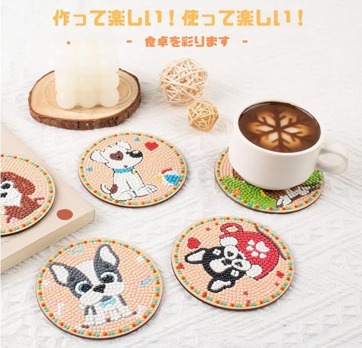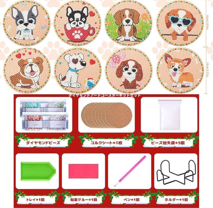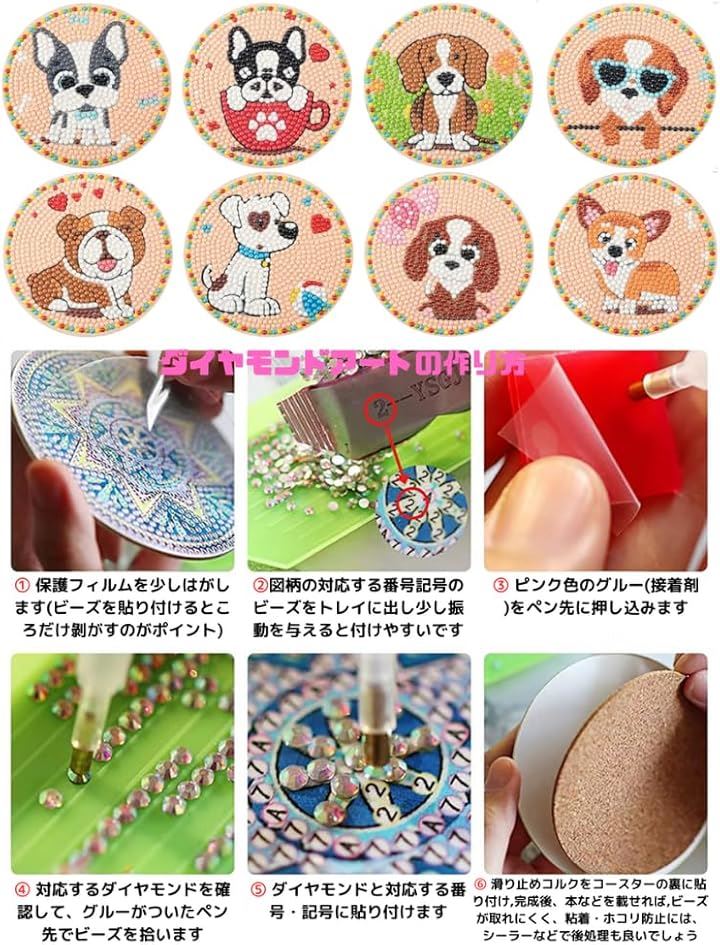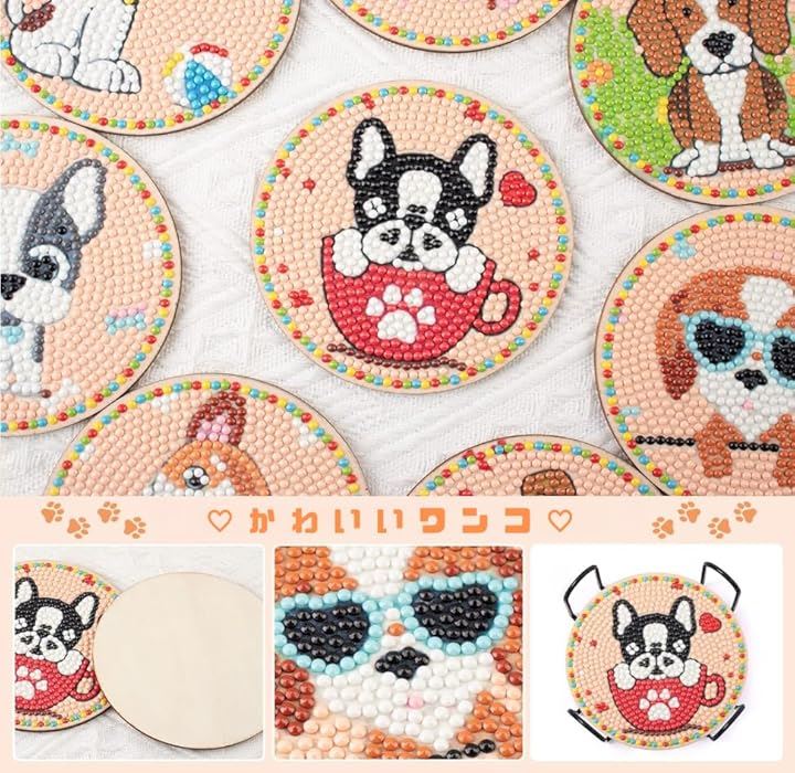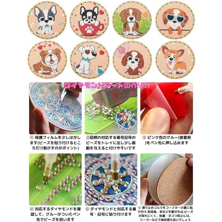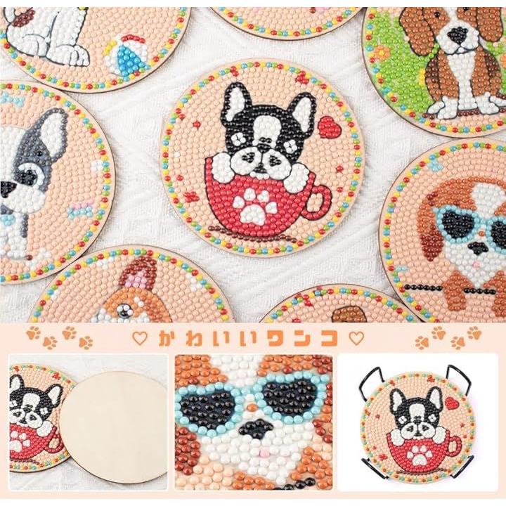 Astartia ダイヤモンドアート コースター キット DIY ダイヤモンドビーズ 5Dダイヤモンド塗装キット 犬 ダイヤモンドペインティング 初心者 大人 子供用 アートクラフト用品 8枚入 ホルダー付き かわいい