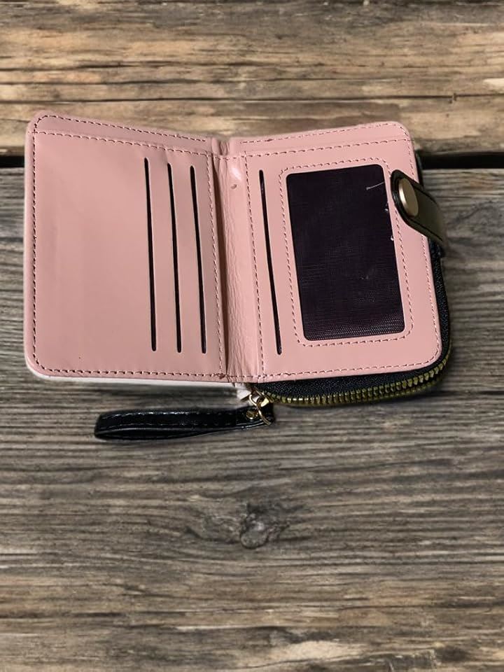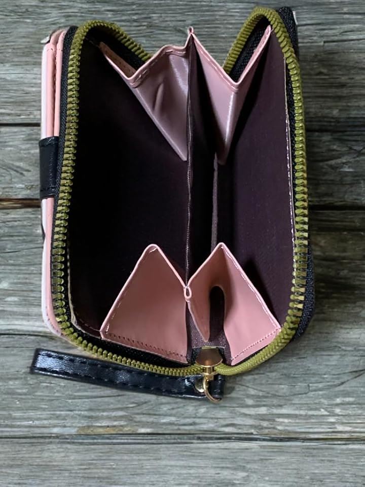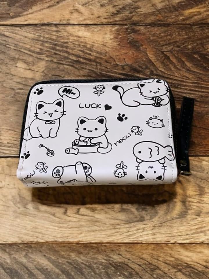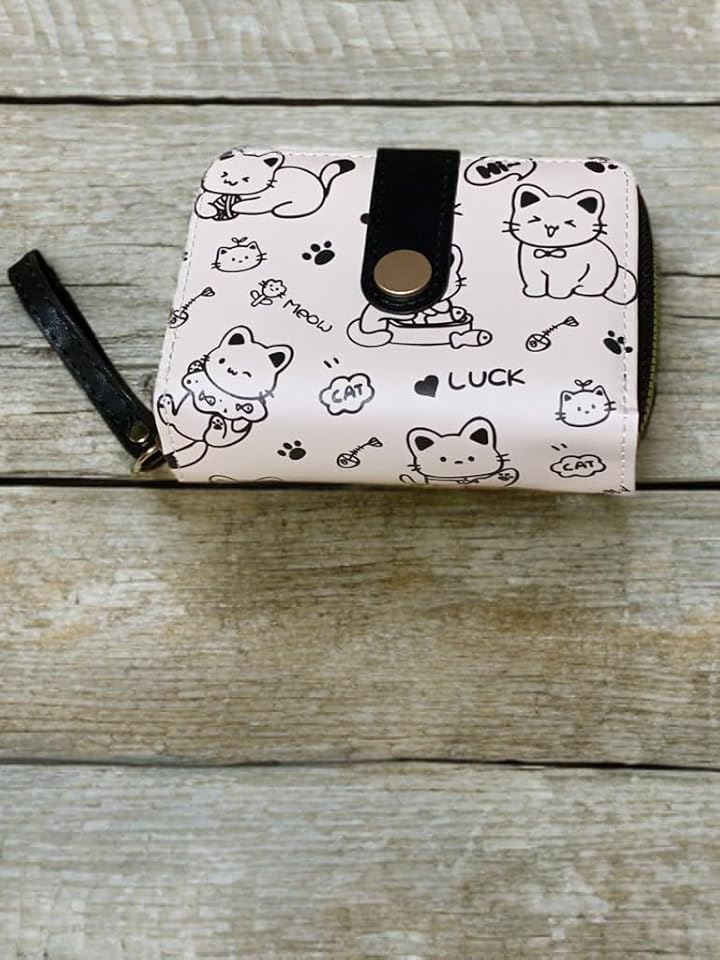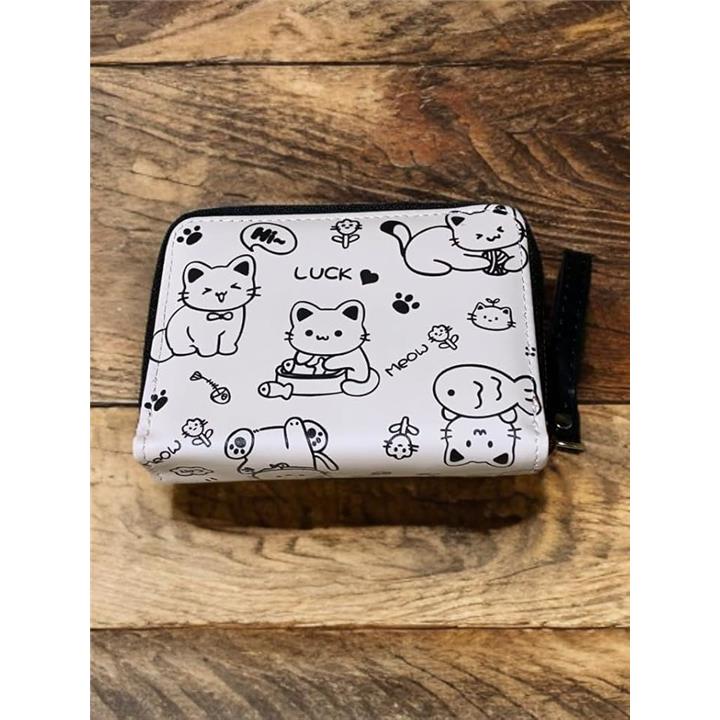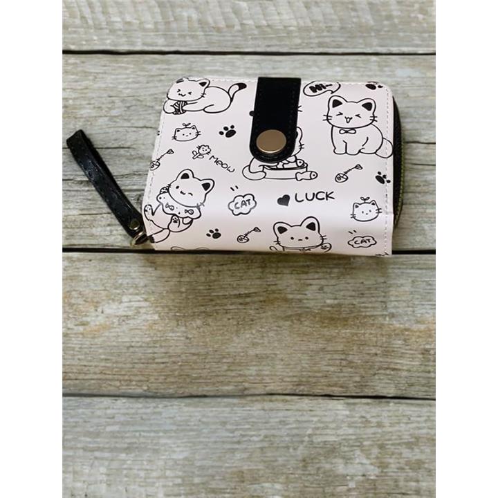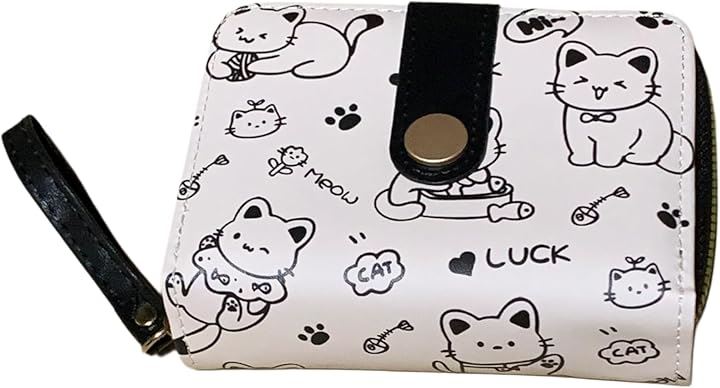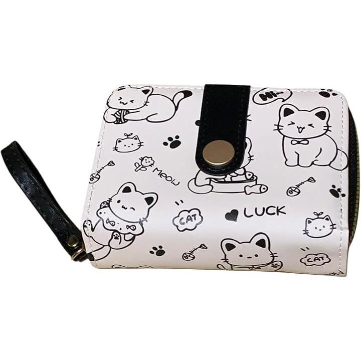 かわいい猫柄 財布 白地 黒デザイン ラッキーキャット柄 ストラップ付き