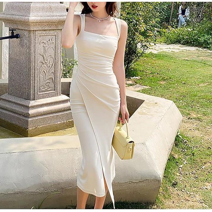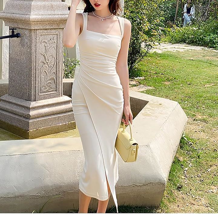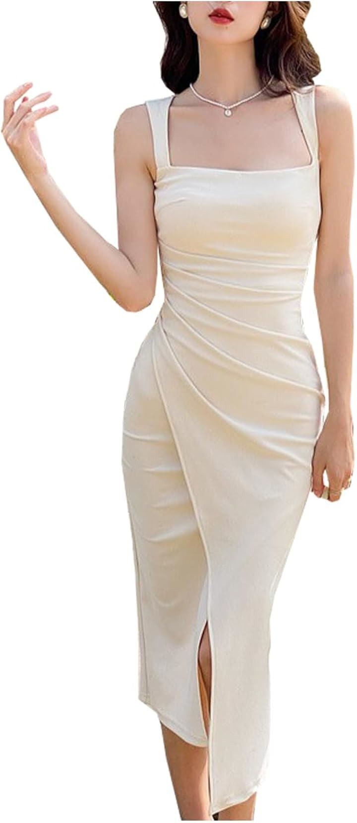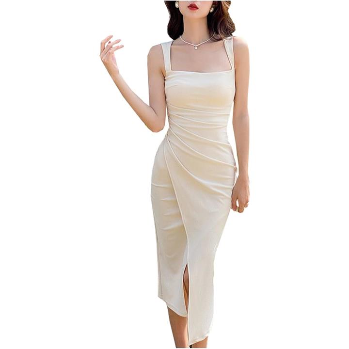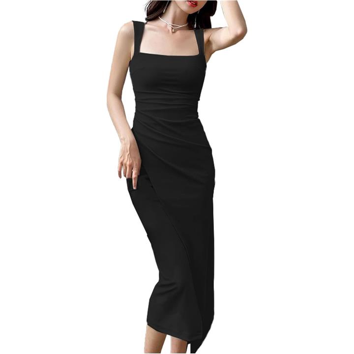 スクエアネック タイトワンピース キャバドレス 膝丈 ミモレ丈 スリット 演奏会 パーティードレス セクシー ノースリーブ 袖なし 大人 鎖骨 肩出し