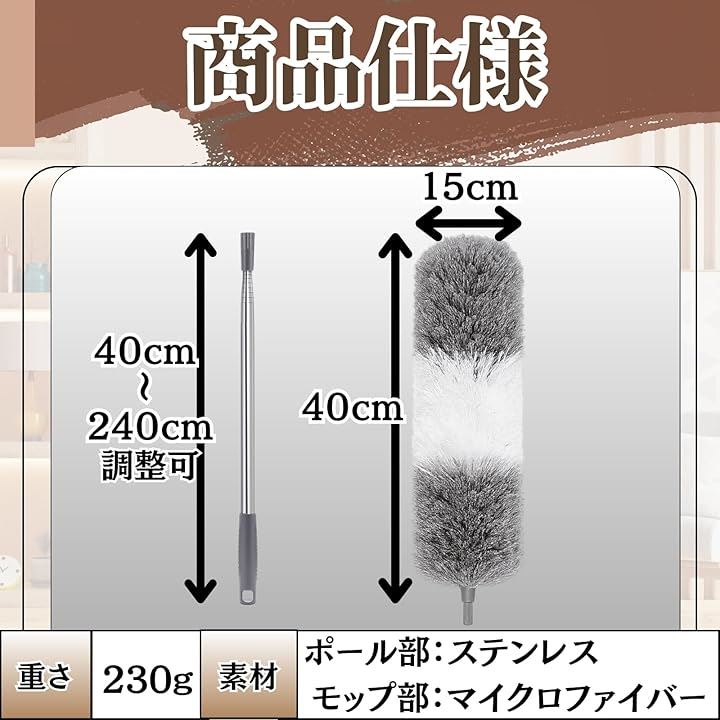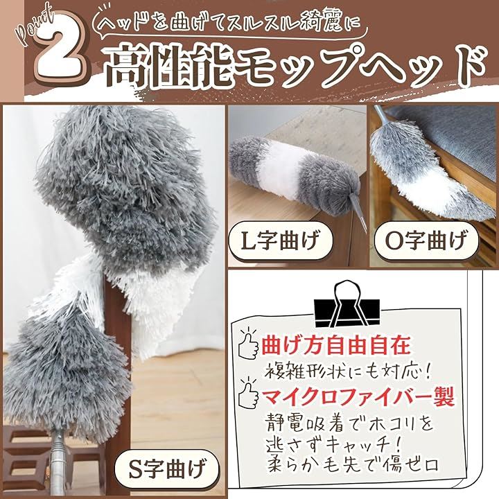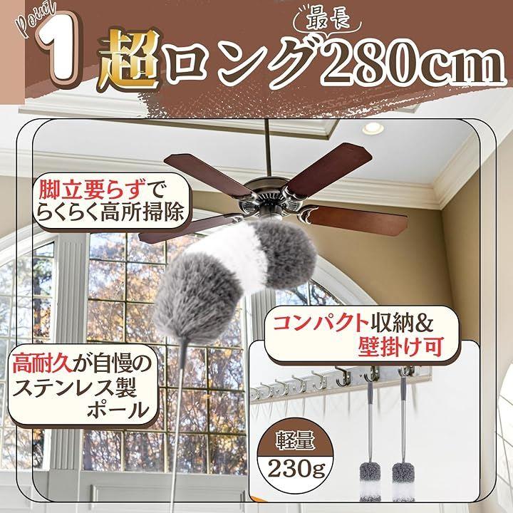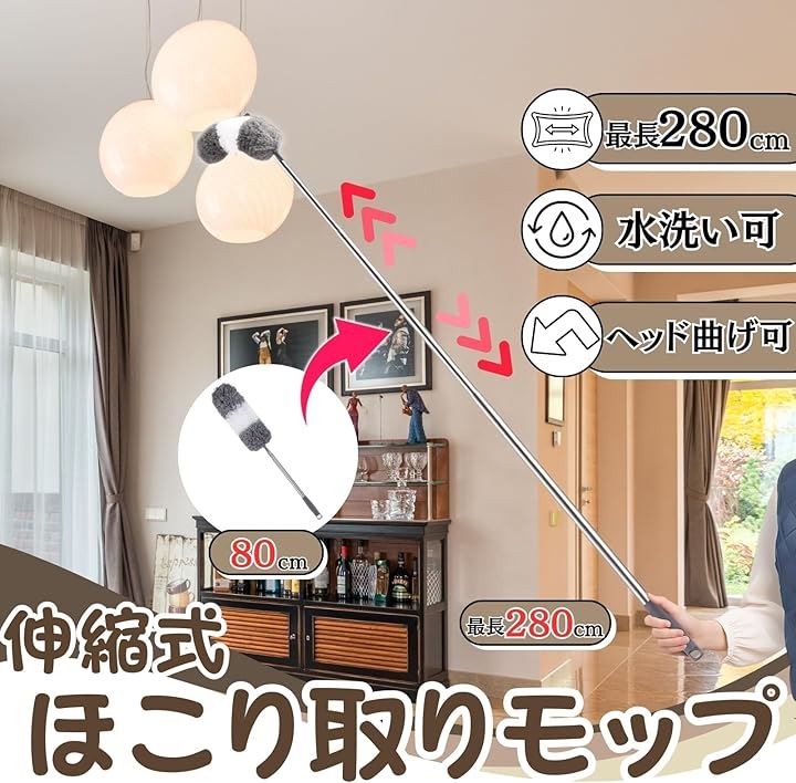 伸縮式 ほこり取り モップ 280cm ヘッドが曲がる 高所 蜘蛛の巣取り棒 水洗い可 天井 壁 掃除