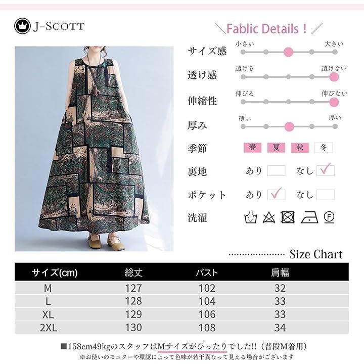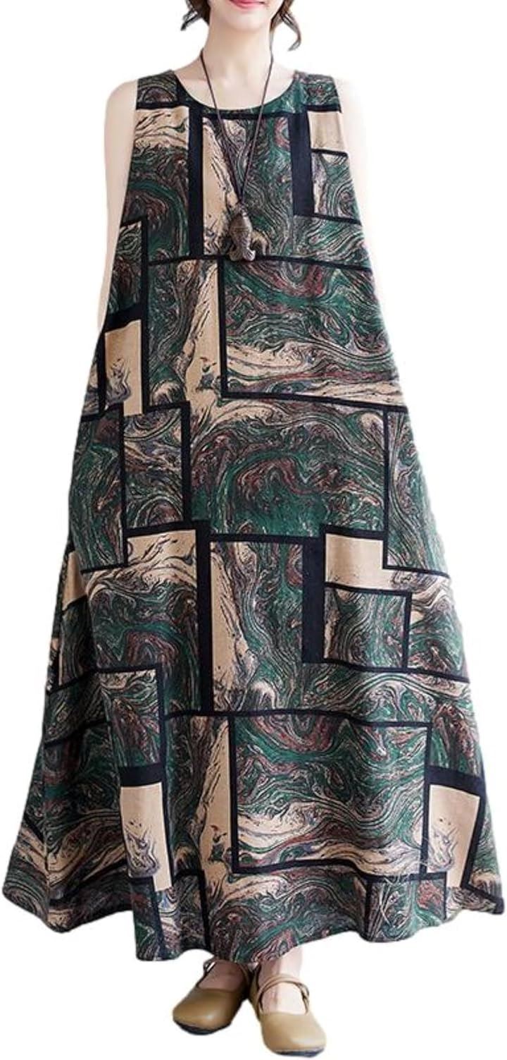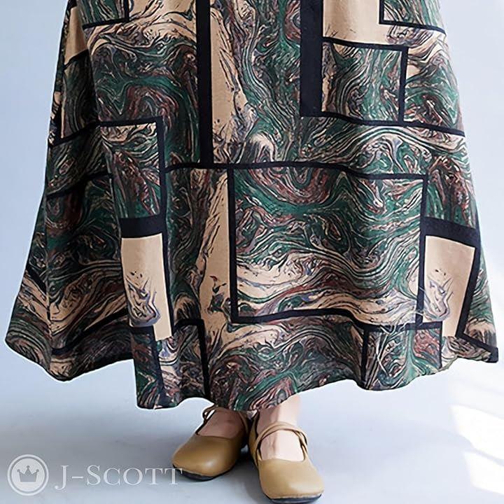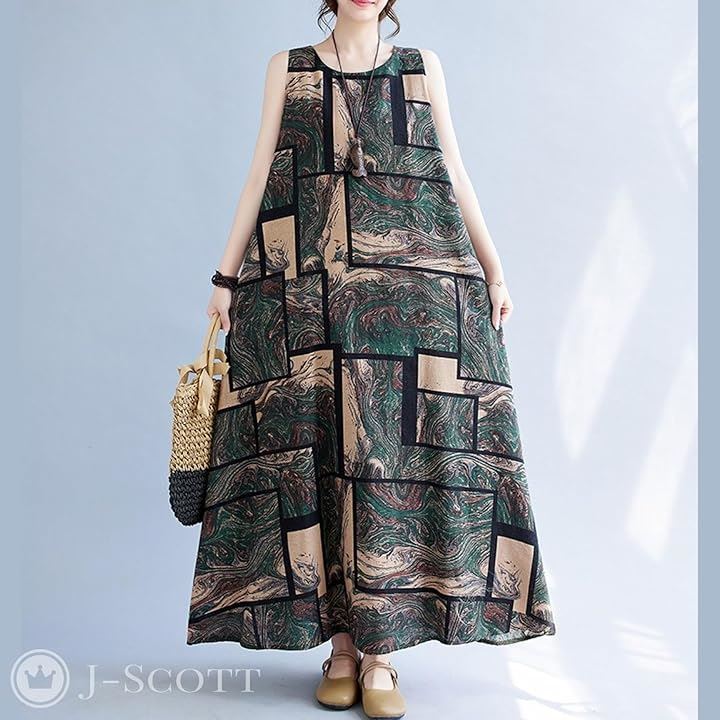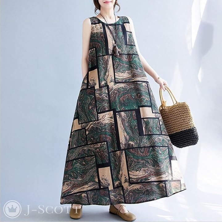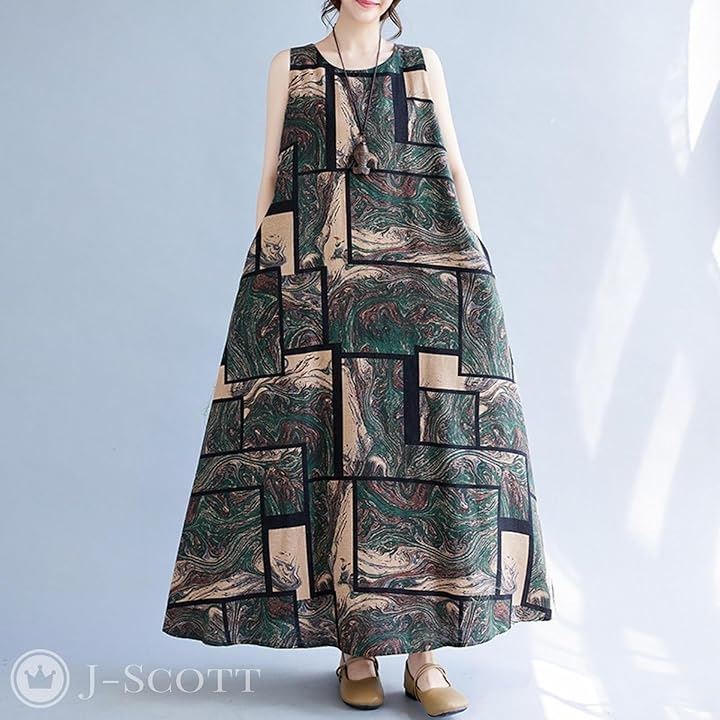 ワンピース レディース ロング ノースリーブ 幾何学 アースカラー Aライン ゆったり