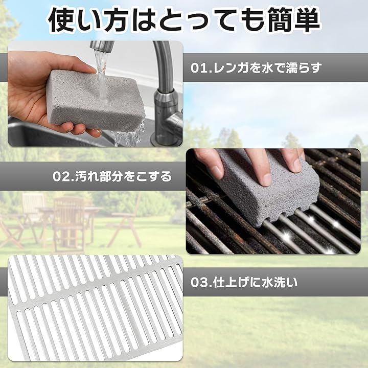 バーベキュー後の網やグリル、鉄板を水で軽く濡らし、本品でこするだけで頑固な焦げや油汚れがみるみる落ちていきます。