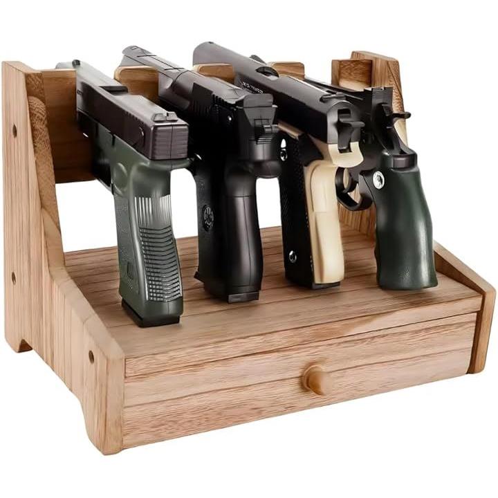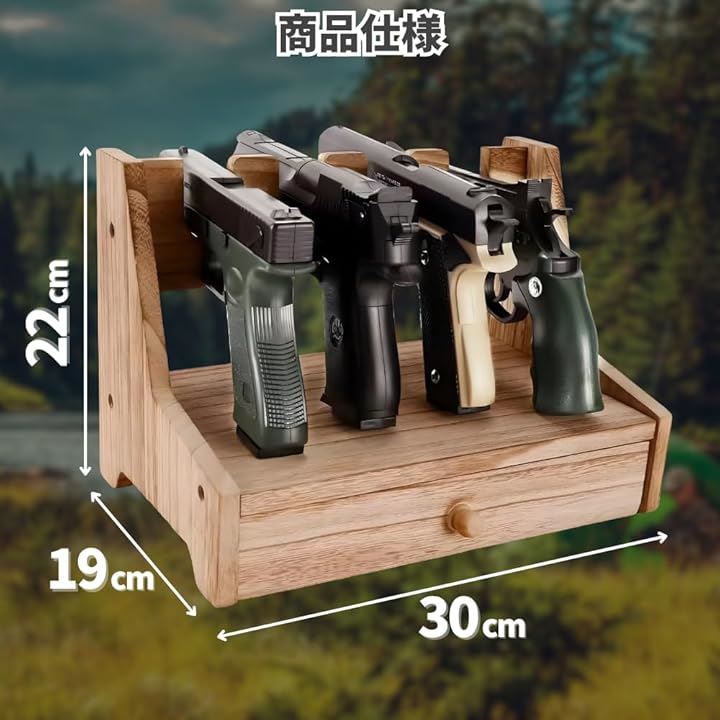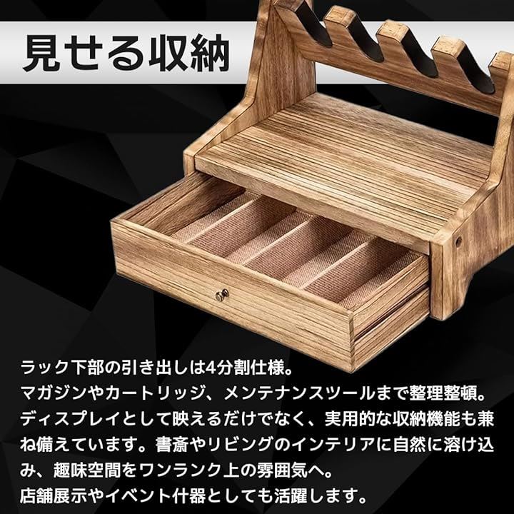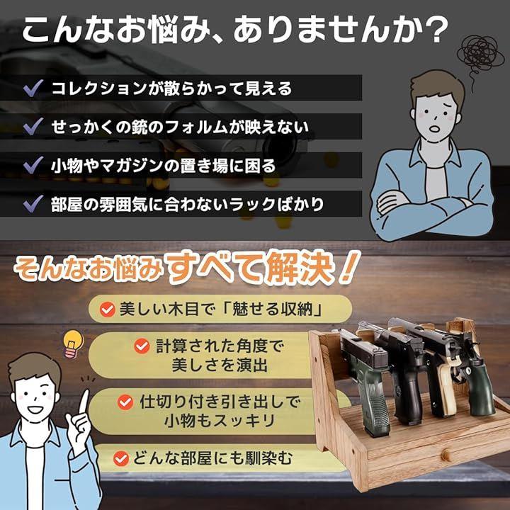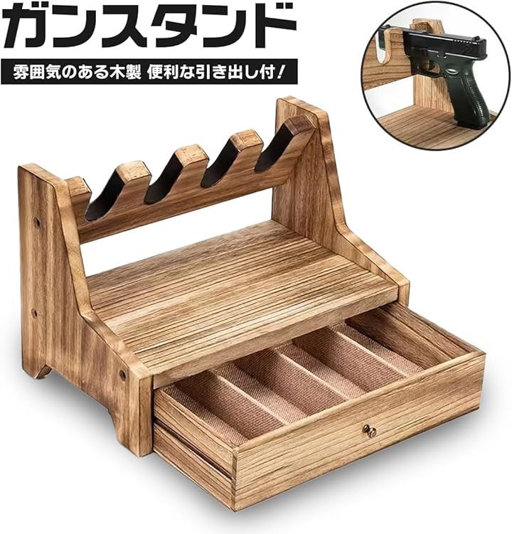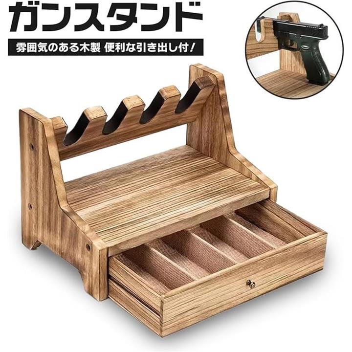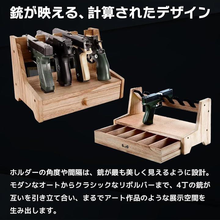 ガンスタンド ガンラック ハンドガン 4丁掛け 銃が映える 木製 引き出し付き 卓上 モデルガン エアガン ディスプレイ 収納