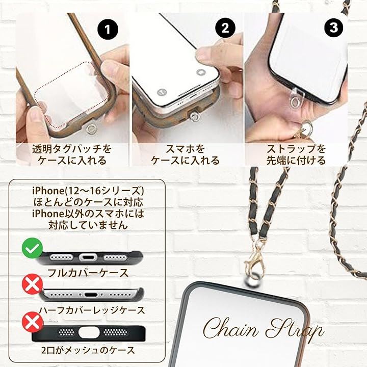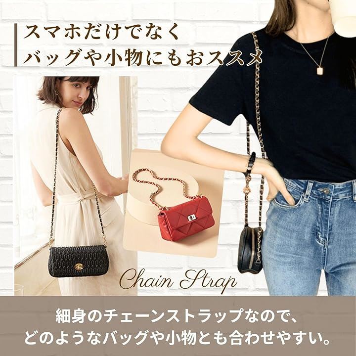 幅0.8cmの細身デザインと高級感あるチェーンで、シンプルなスマホケースも一瞬で華やかなアクセサリーに変わります。