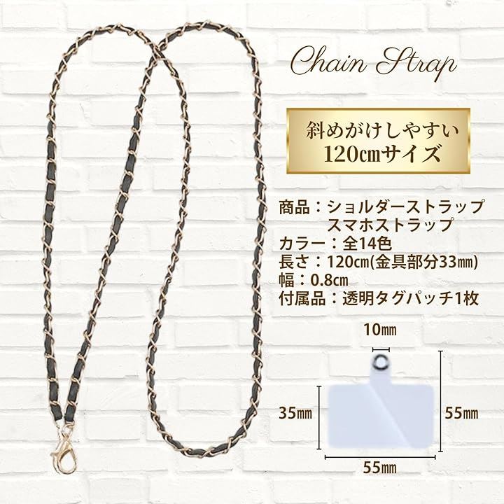 「スマホをおしゃれに持ち歩けるチェーンストラップ」斜め掛けにちょうどいい120cmサイズで、両手が自由になり外出や旅行に大活躍。