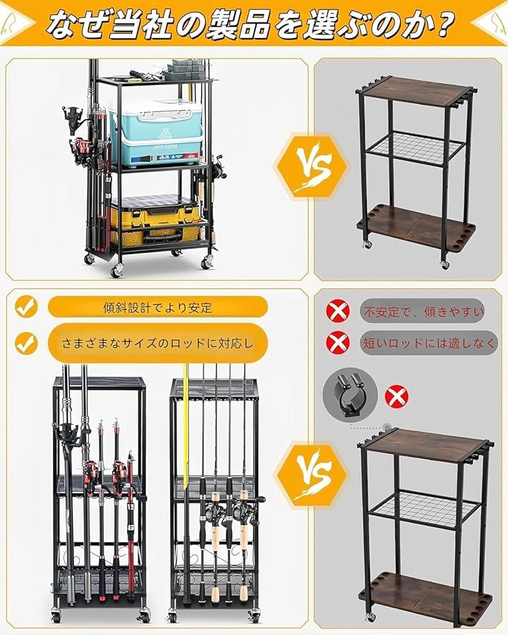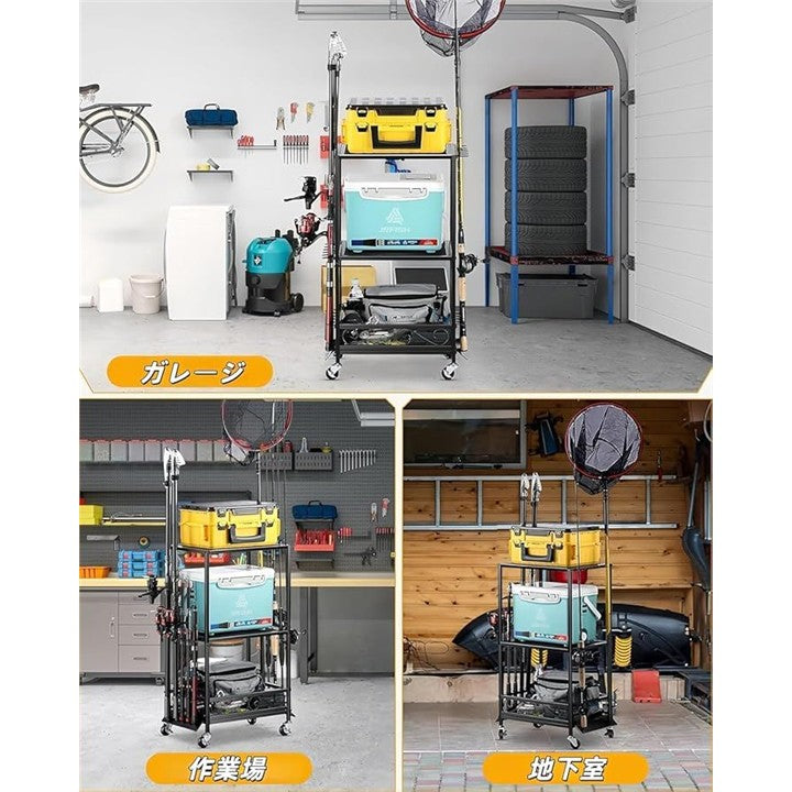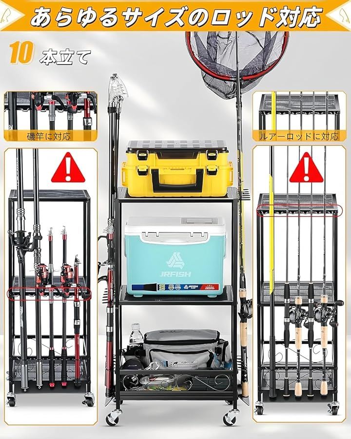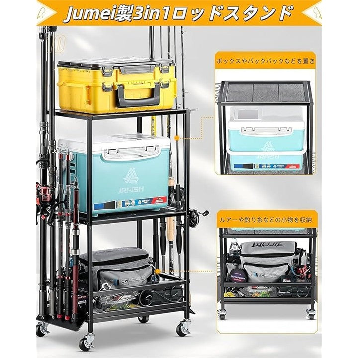 ロッドスタンド 釣り竿立て 釣竿置き 10本用 大容量 3in1 ロッドラック 組立式 釣り竿ラック 釣り具収納 移動式 ロッドホルダー キャスター付き